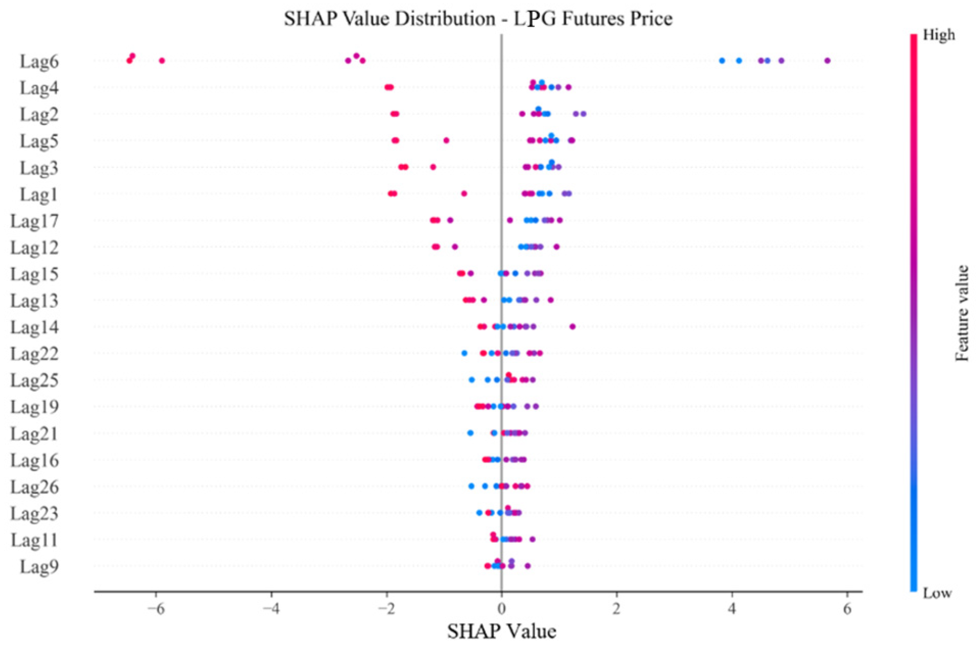 The SHAP value analysis of LPG futures prices reveals a distinct concentration trend characterized by a unimodal decay pattern. The most prominent feature is the futures price from six days before the release of the electricity price, which exhibits significantly greater importance than all other features. This finding suggests that fluctuations in LPG futures prices are strongly transmitted to electricity prices with an approximate six-day lag. Additionally, prices from one to five days earlier also exert a notable influence on electricity price prediction—an effect weaker than that of the sixth day but still considerably stronger than those from other periods. Furthermore, secondary SHAP value peaks appear on the 12th, 17th, and 22nd days before the release date, indicating possible periodic transmission effects. Therefore, it can be inferred that LPG futures prices exert a clear lagged influence on electricity prices, with the strongest impact occurring at approximately a six-day lag.