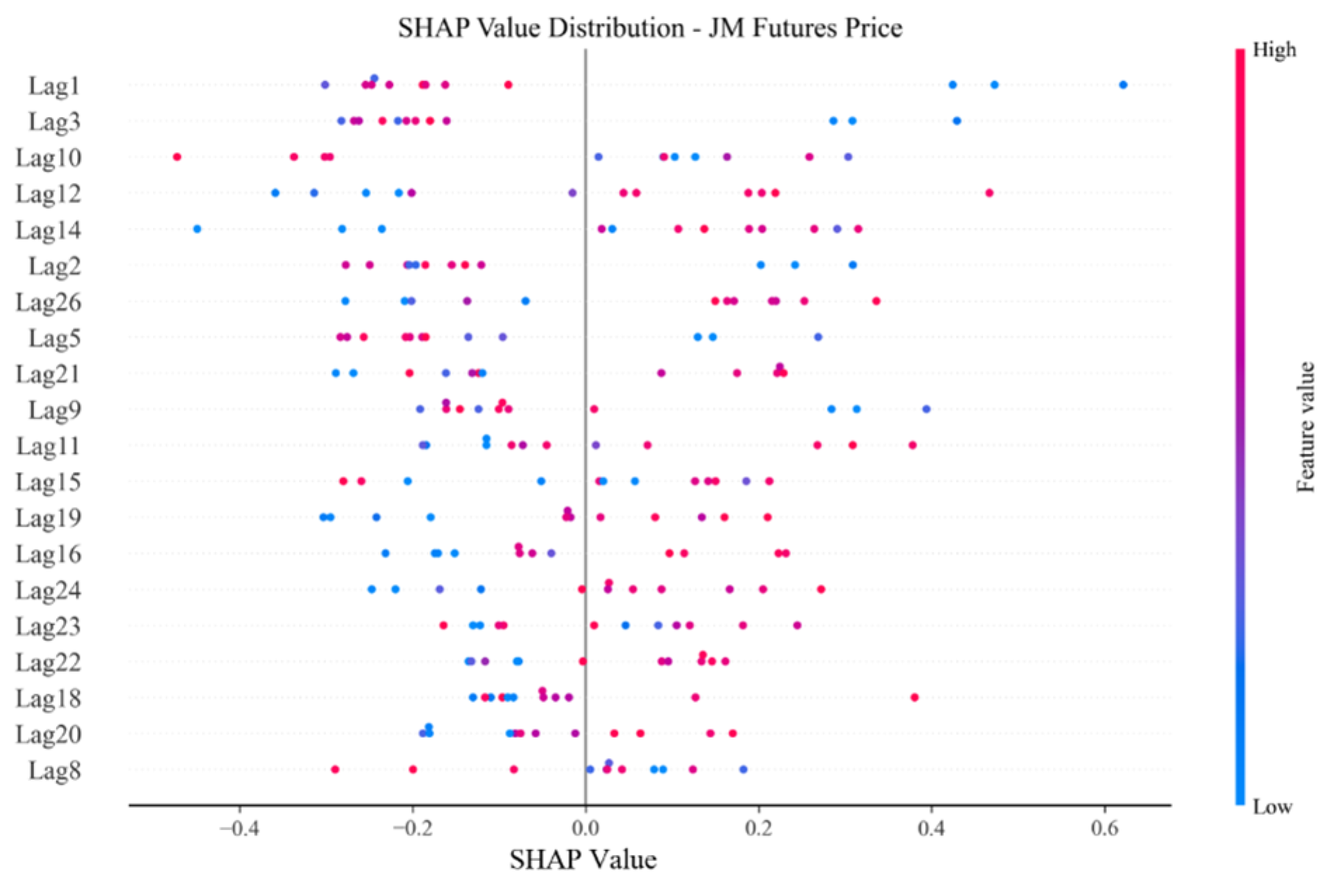 SHAP value analysis reveals a significant correlation between LPG and JM futures prices and monthly electricity trading prices. Specifically, when LPG futures prices decline, monthly electricity trading prices typically increase after an approximately six-day transmission lag. In contrast, when JM futures prices rise, monthly electricity trading prices generally increase after around a twelve-day transmission lag, and vice versa.