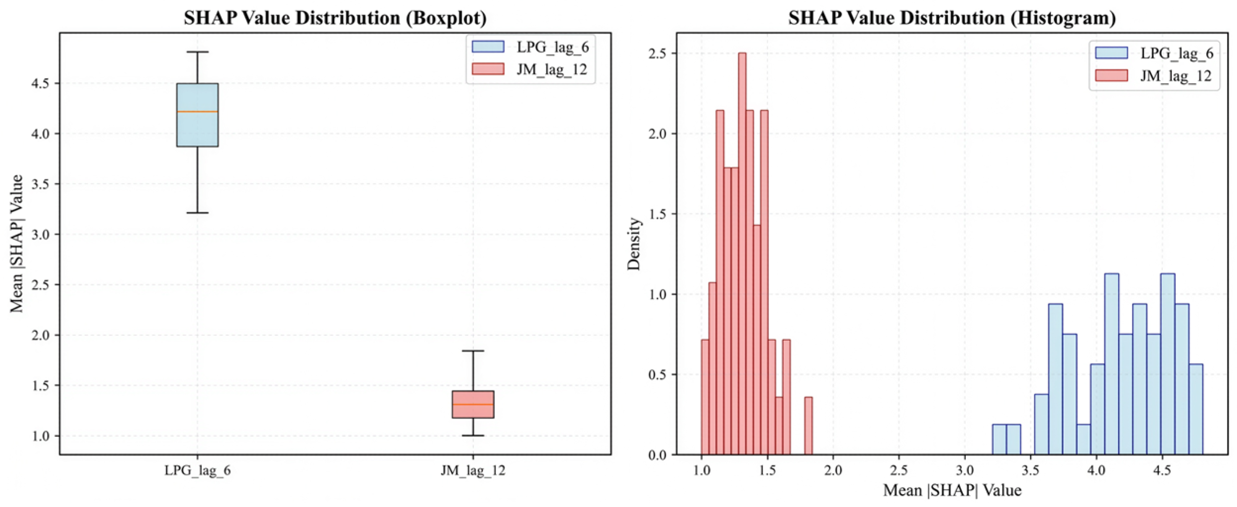 Table 2. For LPG_lag_6, the distribution of the mean absolute SHAP values across 50 Bootstrap iterations ranges from [3.21, 4.81], with a mean of 4.18, a standard deviation of 0.39, and a coefficient of variation (CV) of 0.092. For JM_lag_12, the mean SHAP value distribution ranges from [1.00, 1.84], with a mean of 1.32, a standard deviation of 0.17, and a coefficient of variation of 0.131. The coefficients of variation for both key lagged terms are below 0.15, indicating good stability of the SHAP values across Bootstrap resampling. Notably, the signs of the SHAP values remain consistent across all Bootstrap samples, further confirming the reliability of the direction of influence.