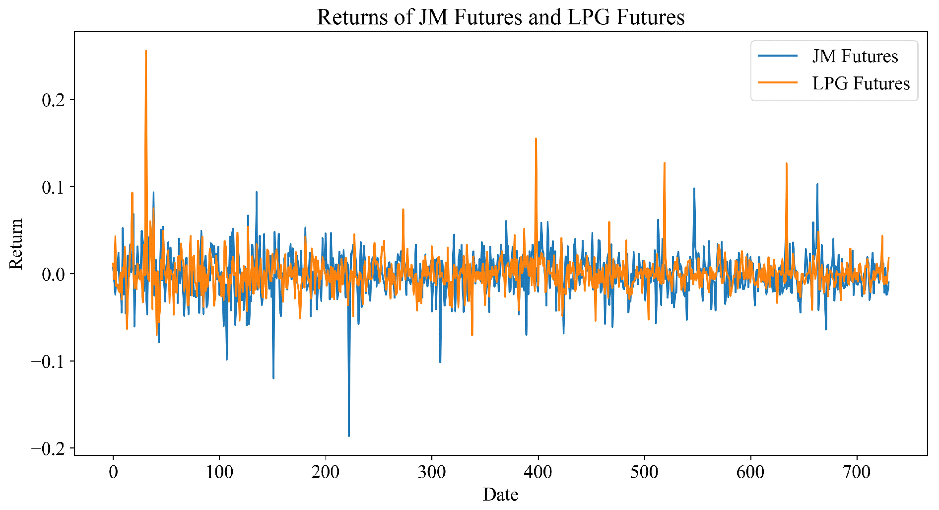 Figure 14, the returns of JM futures have a mean of −0.000692 and a standard deviation of 0.026268, exhibiting slight negative skewness (−0.5065) and a kurtosis of 4.6160, which exceeds the normal distribution benchmark of 3, indicating a heavy-tailed distribution and significant deviation from normality. In contrast, the returns of LPG futures have a mean of 0.000121 and a standard deviation of 0.022541, but display pronounced positive skewness (2.9631) and extreme kurtosis (27.9319), reflecting strong right-skewness and leptokurtic behavior, likewise significantly rejecting the normality assumption.