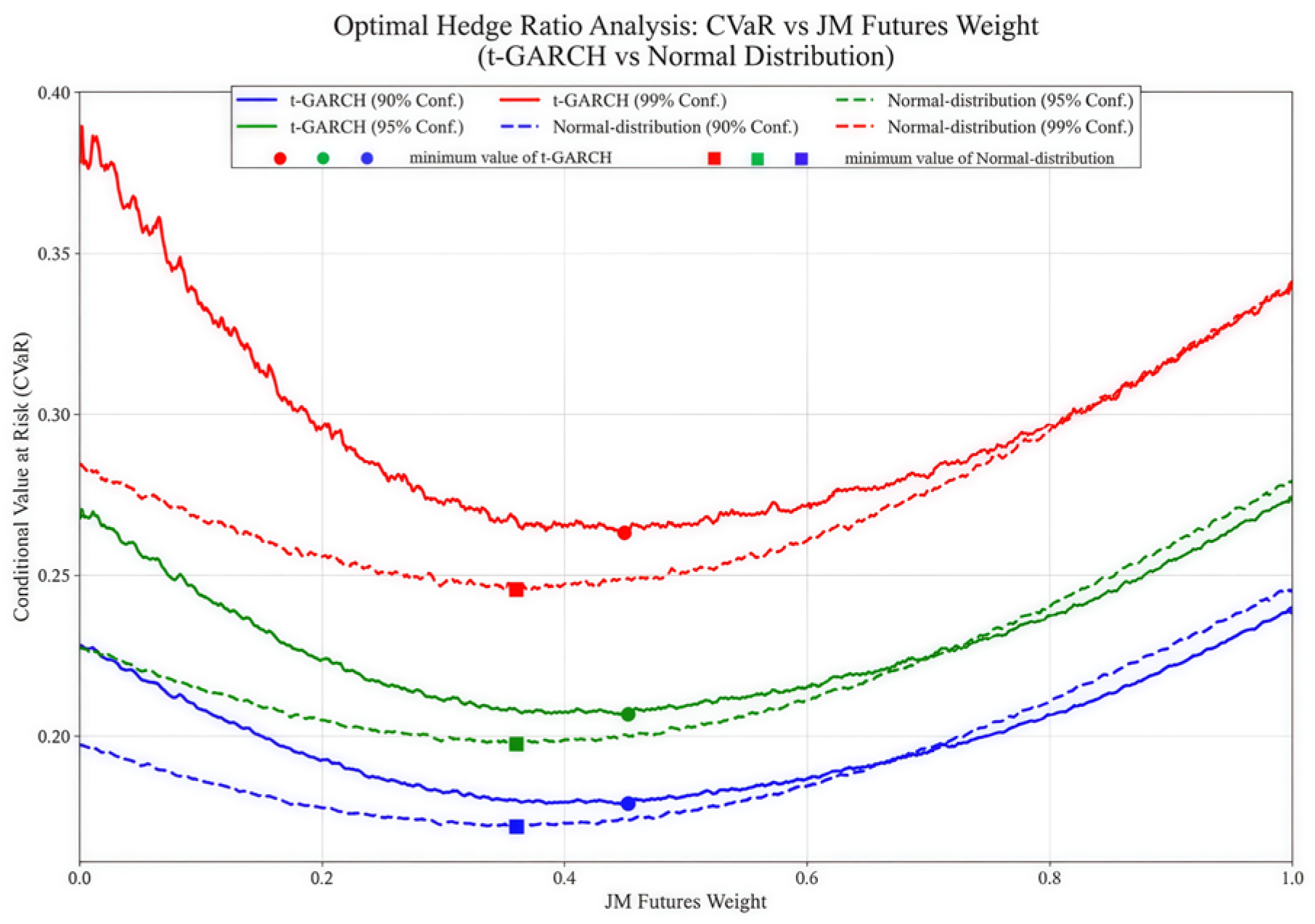 Compared to the normality assumption, the t-GARCH model generally produces higher risk estimates, particularly at high confidence levels, indicating that the t-distribution assumption better captures the risk of extreme events. Regarding portfolio weights, the allocation to JM futures under the t-distribution model is noticeably higher than under the normal model, suggesting that the model recognizes the right-skewed and extreme volatility characteristics of LPG returns and consequently reduces its weight in the optimization to mitigate potential risk.