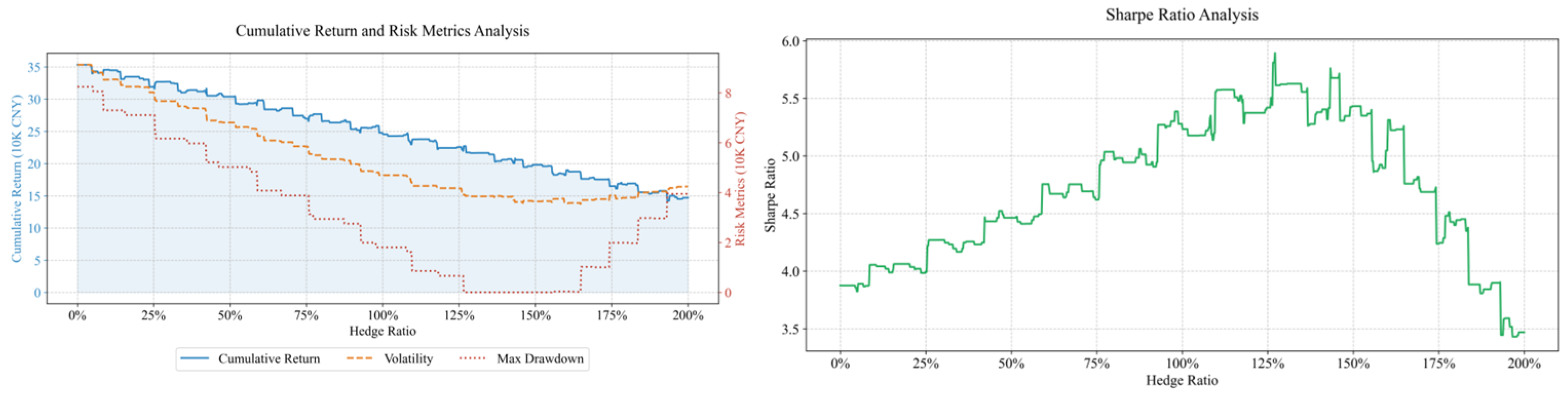 The Sharpe ratio exhibits a “mountain-shaped” curve, peaking at a hedging ratio of 127%, indicating that the strategy achieves an optimal allocation by balancing return and risk. This represents the most efficient configuration in terms of risk-adjusted performance.