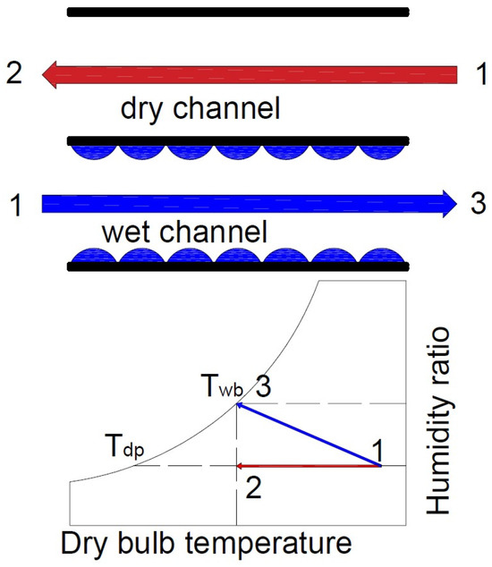 Evaporative systems are categorised into two types: Direct Evaporative Coolers (DECs) and Indirect Evaporative Coolers (IECs). In DEC units, the cooled air comes into direct contact with water in the wet channel. During cooling, the water evaporates directly into the stream of cooled air, lowering its temperature. IEC uses a heat exchanger to cool the air, in which heat is transferred from the cooled air in the dry channel to the air flowing through the wet channel. This prevents moisture from being added to the cooled air. The lowest temperature to which air can be cooled in evaporative devices is the wet-bulb temperature, which depends on the dry-bulb temperature and relative humidity of the air. The cooled air obtained in IEC may have similar parameters to those obtained in VCRS, but unlike them, evaporation systems are innovative and can be considered a cheaper cooling technique. A variation of the IEC system is the Maisotsenko cycle (M-cycle), which allows lower temperatures than the classic ICE. Figure 1 illustrates the heat-exchange process in the IEC and diagrams the thermodynamic processes within the unit.