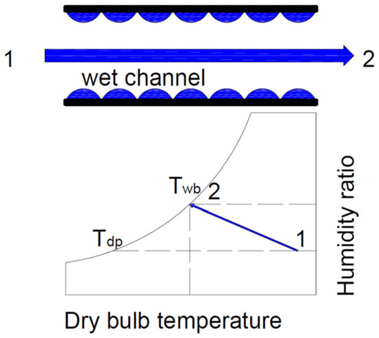 In the first concept of the M-cycle, the product is the main stream of cooled air, which is obtained through heat exchange with the so-called auxiliary stream of air flowing through the wet channel. The inlet air is divided into two parts, one of which, i.e., the main stream, flows through the dry channel and is used, for example, to cool rooms. The second part, i.e., the auxiliary air stream, is first pre-cooled during heat exchange with the air flowing through the wet channel, and then flows through the wet channel, further lowering its temperature. Cooling systems using the M-cycle employ cross-flow heat and mass exchangers (HMXs). As in IEC systems, the cooled air (product) is not moisturised. Theoretically, the lowest temperature achieved in the M-cycle is the dew point temperature. The efficiency of the M-cycle can be determined based on the dew point efficiency: