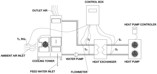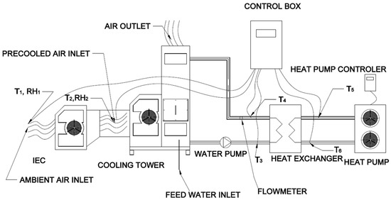 The research station for Stage II of the study was expanded to include a precooling system for the cooling tower inlet air. The optimal solution is the indirect evaporative cooling system CooleradoTM, manufactured by Seeley International form Lonsdale, Australia, which provides a complete configuration and enables the supply-air temperature to be reduced below the wet-bulb temperature. Since this system is initially designed to cool indoor spaces by delivering conditioned air, it is equipped with fans, a water distribution system, and an integrated control unit. The complete schematic of the Stage II setup is shown in Figure 5.