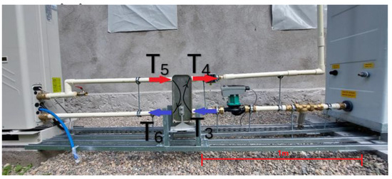 Stage I involved the installation of the cooling device, i.e., an open-circuit cooling tower, and the heating device, represented by an air-source heat pump. The two units were hydraulically separated by a plate heat exchanger. The cooling tower circuit is the secondary circuit, while the heat pump circuit is the primary circuit. The secondary circuit was equipped with a circulation pump and the necessary fittings. The entire system was additionally equipped with an automation unit and measurement sensors. The schematic of the laboratory stand used for the Stage I tests is shown in Figure 3.