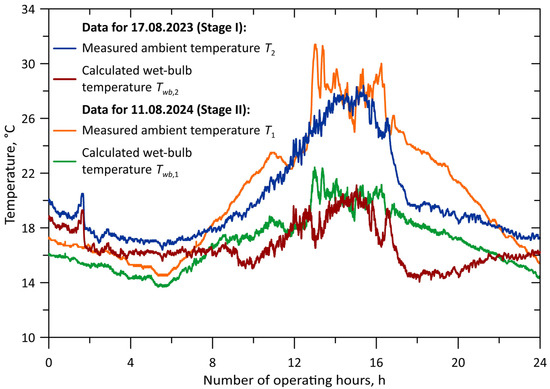 Ambient (dry-bulb) and wet-bulb temperatures for 17 August 2023 (Stage I) and for 11 August 2024 (Stage II).