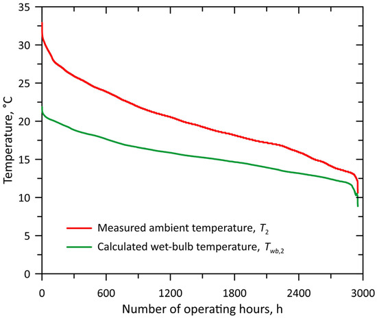 An analysis of climate data for Ząbkowice Śląskie was conducted to determine the most suitable cooling and heating solutions. The maximum and minimum ambient temperatures are 32.5 °C (occurring on 9 July at 15:00) and −17.4 °C (recorded on 12 January at 23:00), respectively. The average dry-bulb temperature is 8.6 °C. The maximum wet-bulb temperature is 22.7 °C on 21 July at 9:00, corresponding to an ambient temperature of = 26.8 °C and coupled with a relative humidity of = 71.3%, while the minimum wet-bulb temperature is −17.48 °C on 12 January at 23:00, corresponding to = −17.4 °C and = 99.3%. The average wet-bulb temperature is 6.5 °C. The maximum ambient humidity is 100%, occurring for approximately 276 h per year; the minimum was recorded on 29 May at 13:00 and amounted to 29.5%, with = 23.3 °C and = 13.1 °C, and the average ambient humidity is 79.1%. Sorting the wet-bulb temperatures from highest to lowest, it can be seen that the sixteen consecutive highest wet-bulb temperatures correspond to dry-bulb temperatures below 30 °C. The highest wet-bulb temperature recorded for Ząbkowice Śląskie is 22.7 °C. The MITA cooling tower selection software recommends a design wet-bulb temperature of 21 °C for this location. This means that the cooling tower will not achieve the required capacity at wet-bulb temperatures above this value. In the case of Ząbkowice Śląskie, such wet-bulb temperatures only occur for about 35 h a year.