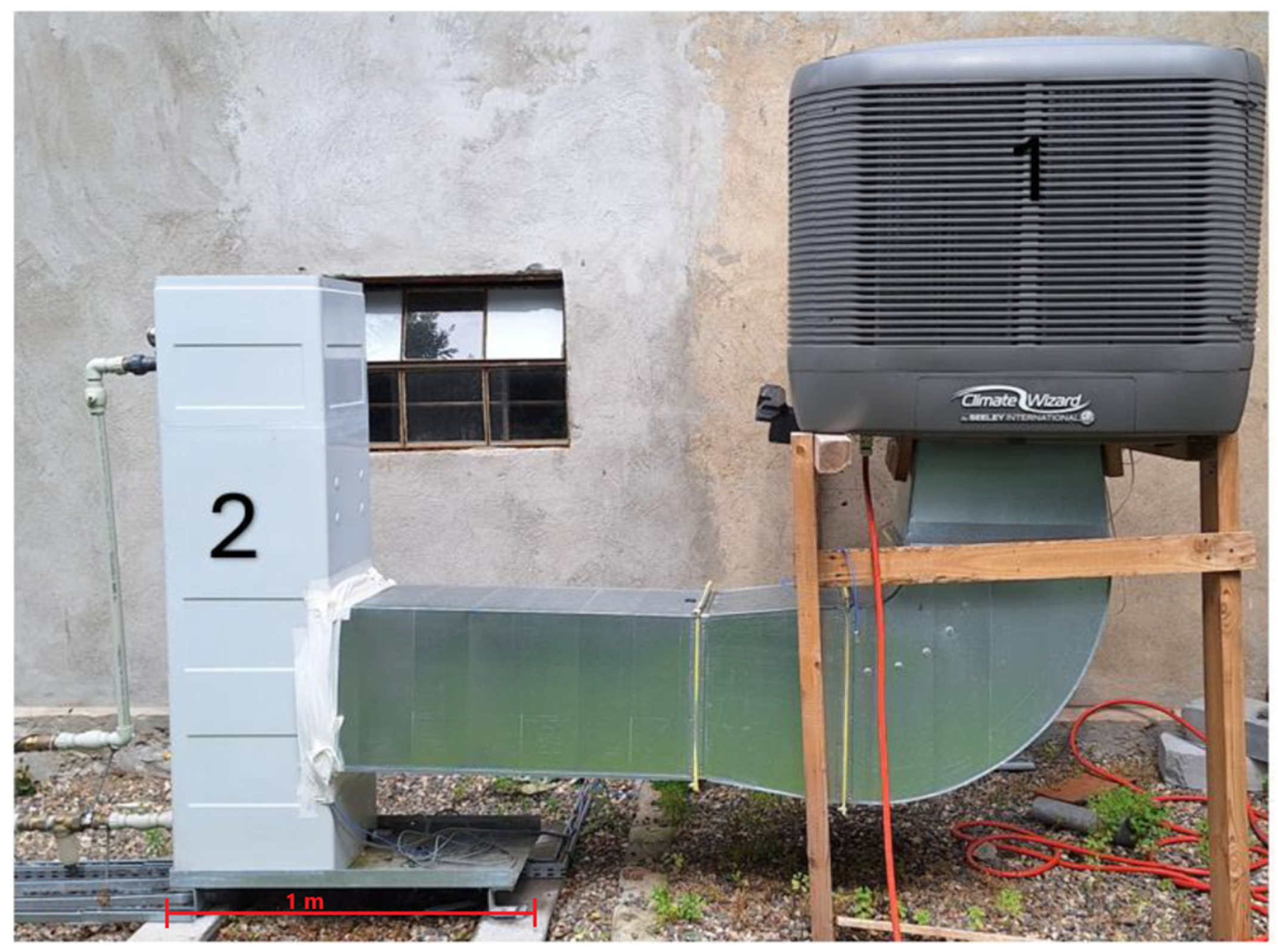 - Heidarinejad, G.; Bozorgmehr, M.; Delfani, S.; Esmaeelian, J. Experimental investigation of two-stage indirect/direct evaporative cooling system in various climatic conditions. Build. Environ. 2009, 44, 2073–2079. [Google Scholar] [CrossRef]
