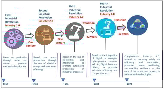 Digital Twins (DTs) industrial implementation represents a fundamental advance in the era of Industry 4.0 and beyond, towards Industry 5.0 [1,2]. In essence, a DT is a real-time dynamic virtual replica of a physical asset, system, or process that connects to its real counterpart through sensors and data. Figure 1 illustrates the evolution of industries in the implementation of technologies until today with the implementation of DTs.