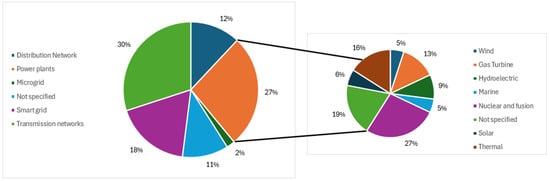 The implementation of DTs in power grid planning can be considered booming given the technological innovation it brings, as well as a great number and variety of benefits from various perspectives; however, it is recognized that one of the main reasons is to define the scope and level of detail for the development of virtual models [3]. Of course, this depends on the field where the DT is to be implemented, so it is necessary to recognize the levels of impact that these have had in the planning of electrical networks. Figure 2 illustrates in percentage terms the amounts of DT research there is for certain sectors of electricity grids.