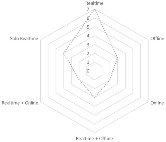 With this research, it can also be deduced that, although not all DTs are capable of working in real-time, in the electrical industry the developments carried out so far are 100% under this mode of use. Aside from each supplier depending on its market niche, which orients the other attributes of its software, 42% of those investigated additionally have an offline mode of use and 29% an online mode, as shown in Figure 3.