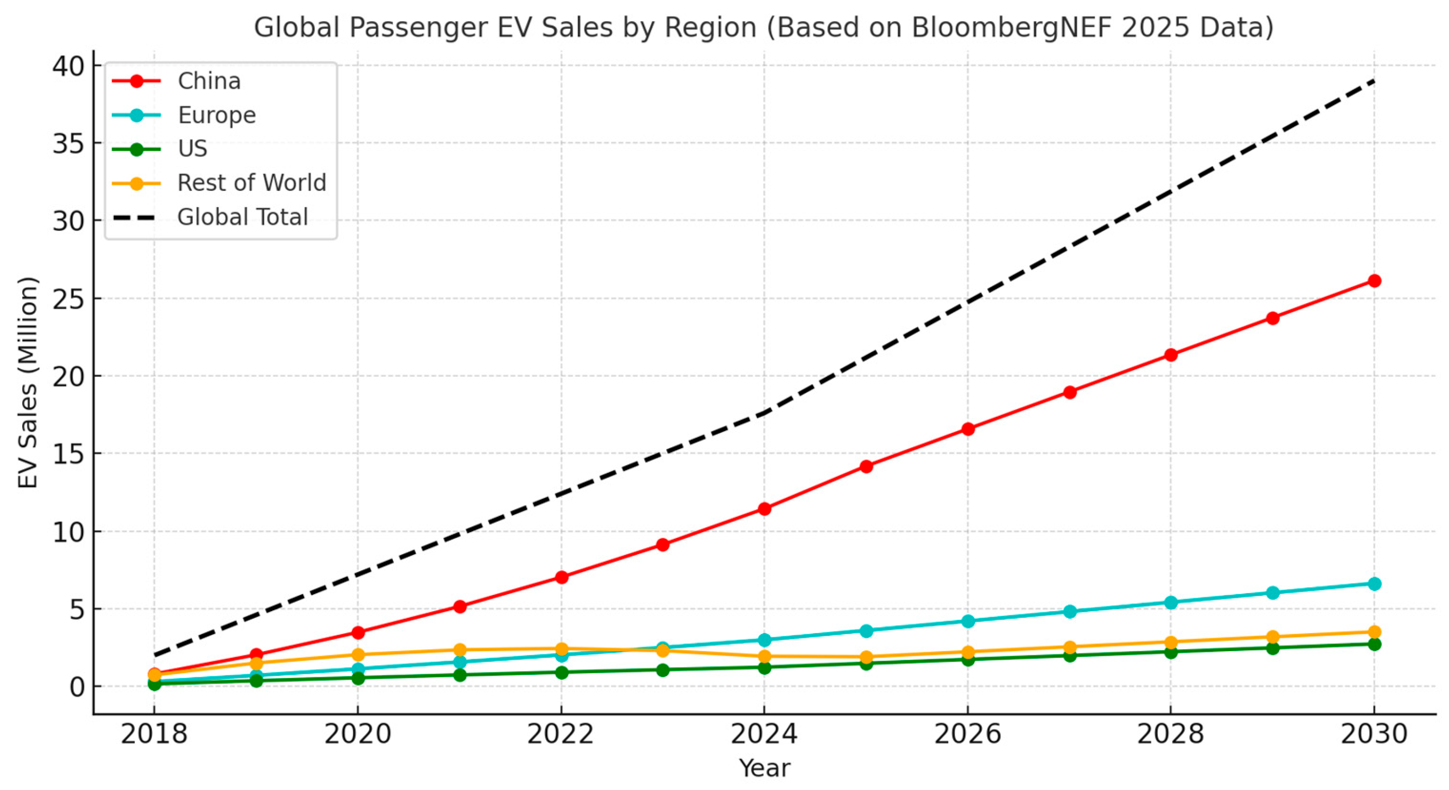 - BloombergNEF. Electric Vehicle Outlook 2025. BloombergNEF Insights—Clean Transport, 1 6. 2025. Available online: https://about.bnef.com/insights/clean-transport/electric-vehicle-outlook/ (accessed on 10 November 2025).