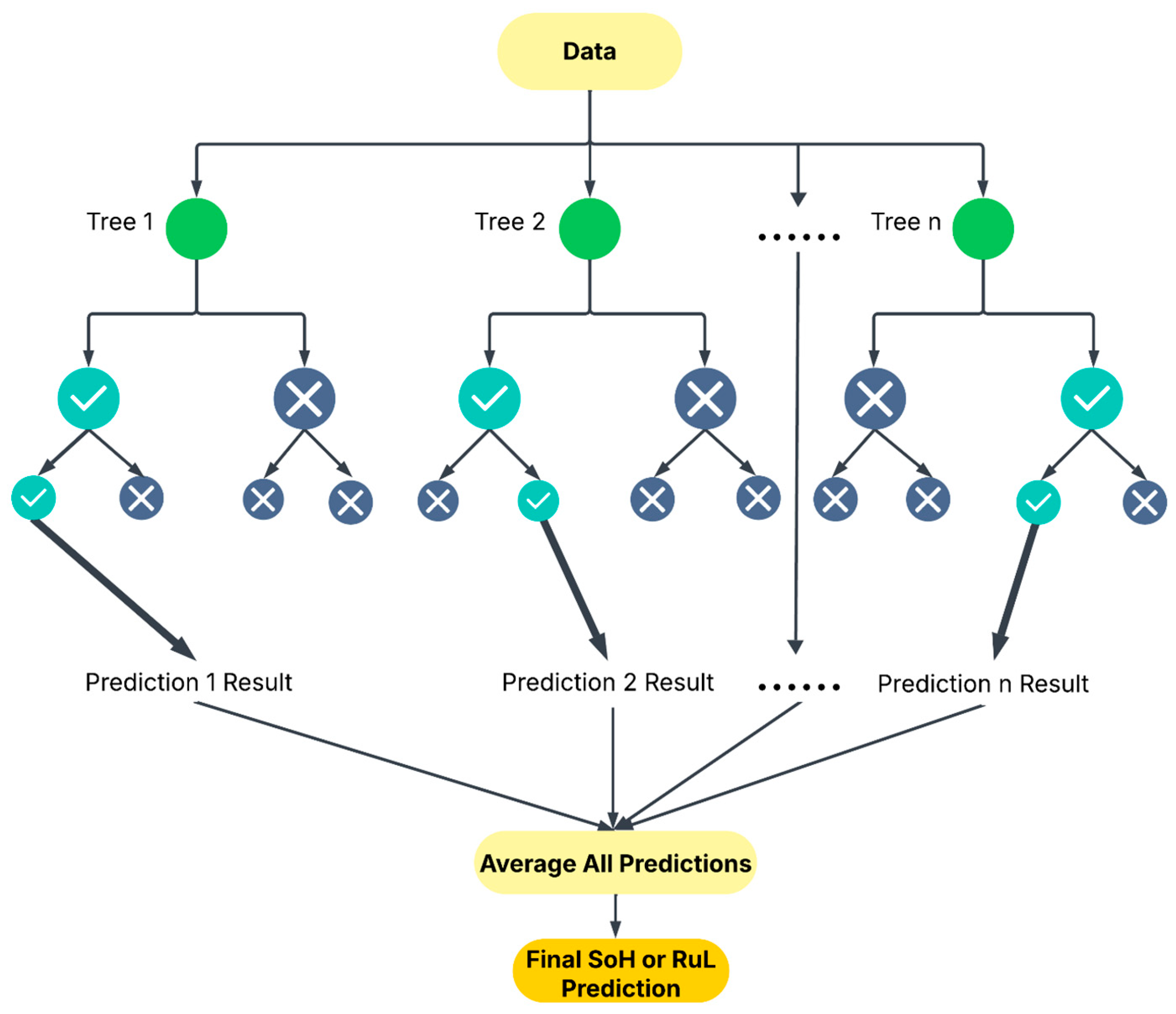 - Gotz, J.D.; Galvão, J.R.; Corrêa, F.C.; Badin, A.A.; Siqueira, H.V.; Viana, E.R.; Converti, A.; Borsato, M. Random forest-based grouping for accurate SOH estimation in second-life batteries. Vehicles 2024, 6, 799–813. [Google Scholar] [CrossRef]