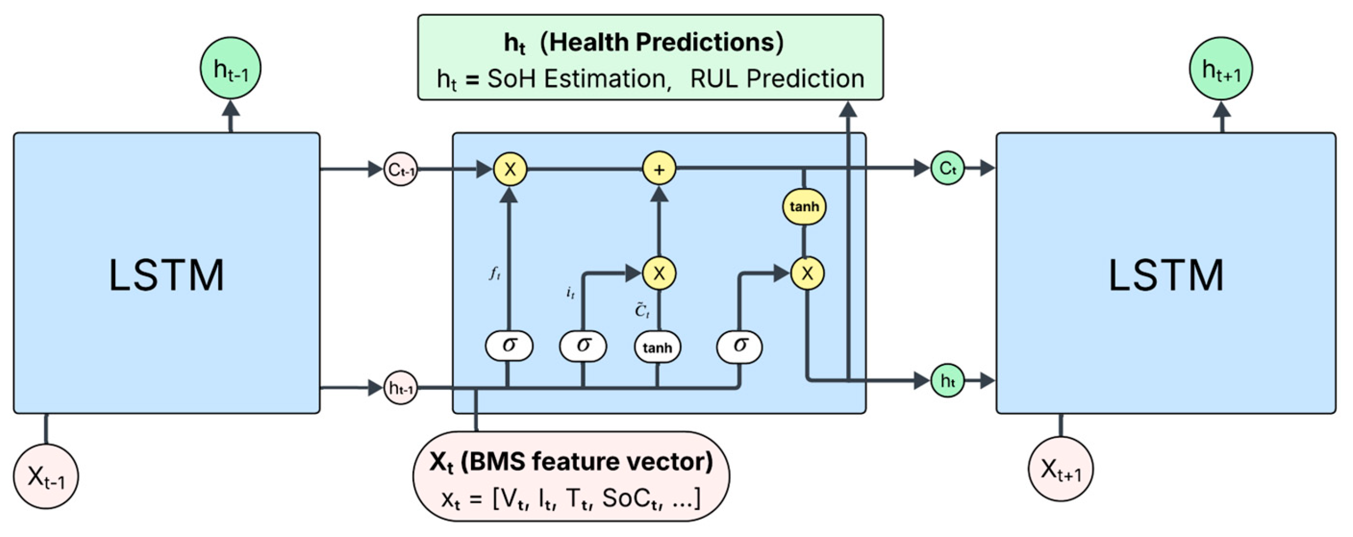 - Xu, G.; Xu, J.; Zhu, Y. LSTM-based estimation of lithium-ion battery SOH using data characteristics and spatio-temporal attention. PLoS ONE 2024, 19, e0312856. [Google Scholar] [CrossRef]
