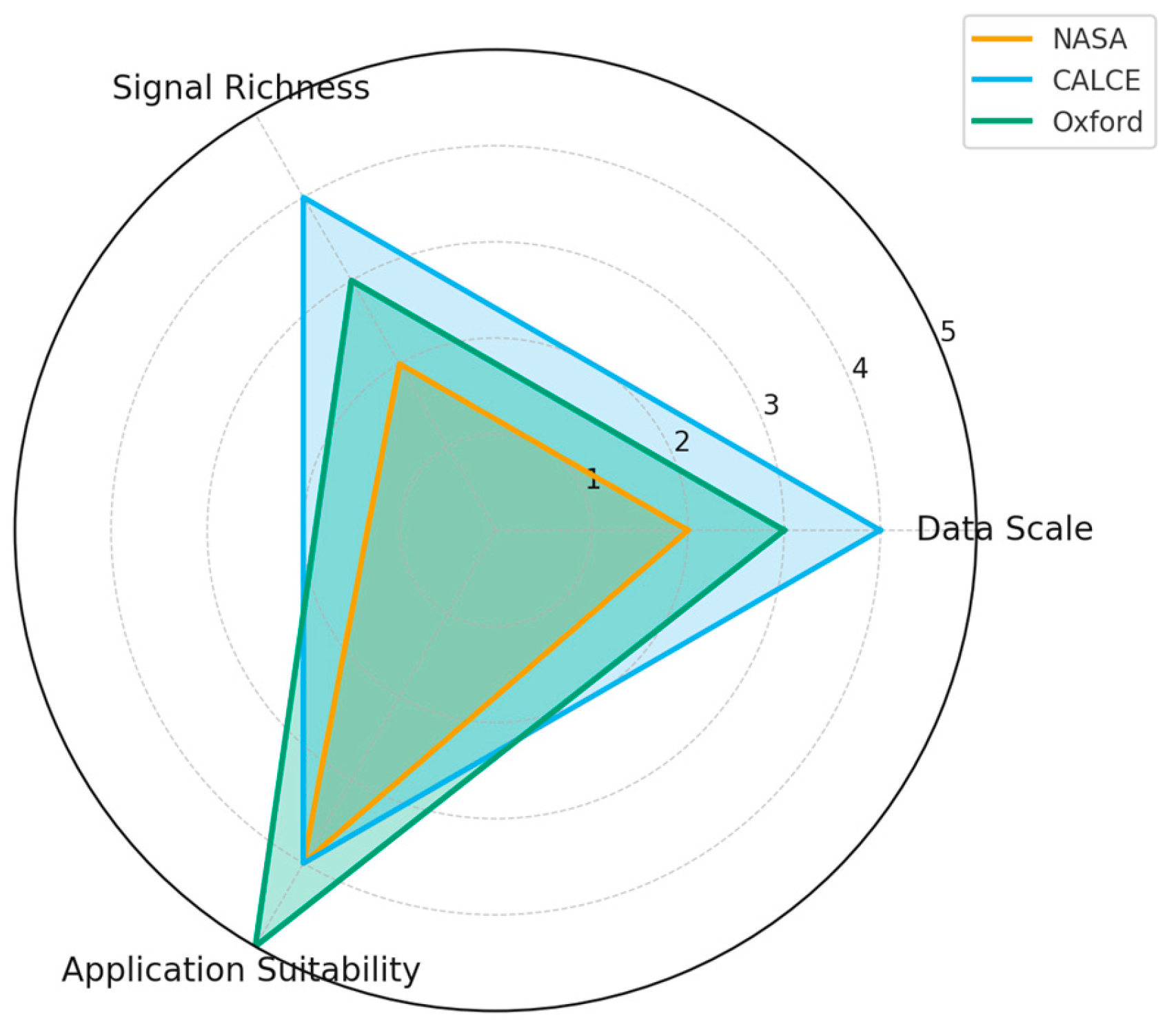 | Oxford battery degradation dataset | Dozens of commercial Li-ion cells | Voltage–capacity curves Current | High-quality, low-noise data | Limited number of cells |