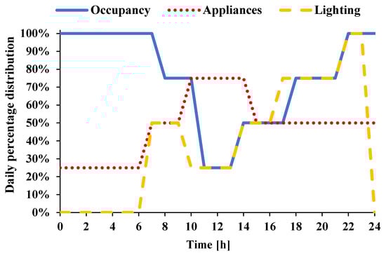 Daily percentage distribution profile of occupancy, appliances, and lighting for the examined residency.