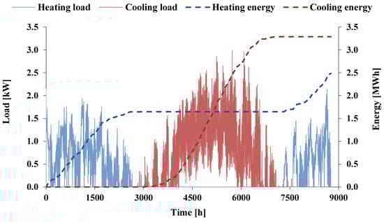 Heating and cooling hourly load and cumulative energy demand for the baseline scenario.