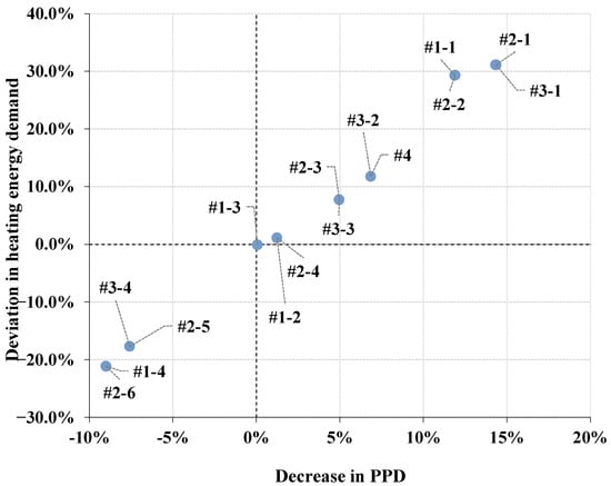 Multi-criteria evaluation of the heating energy savings and the decrease in the PPD index for the heating period.
