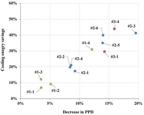 Multi-criteria evaluation of the cooling energy savings and the decrease in the PPD index for the cooling period.