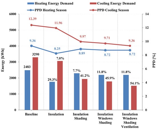 Based on the results of the multi-objective evaluation process, Figure 7 illustrates the annual energy demand and calculated PPD index for the optimum one-intervention (Ins), two-intervention (Ins and Shad), three-intervention (Ins, Win, and Shad), and four-intervention scenarios. This figure aids in prioritizing the implementation of renovation technologies, identifying thermal insulation as the top priority, followed by shading, windows, and, finally, mechanical ventilation systems for cooling. It is useful to state that the incorporation of insulation is vital for reducing the heating loads, while the addition of shading elements is the most important action for mitigating cooling energy loads. However, the application of shading and the restriction of the incoming solar irradiation during the winter period result in significant heating penalties. Therefore, a proper analysis is needed to balance the benefits and drawbacks of shading, a technique that is generally recommended for the climate conditions of Greece. Moreover, the multiple application of renovation actions is calculated to be more effective in improving a building’s indoor thermal comfort conditions. Specifically, the PPD index of the baseline scenario is found at 12.39% for the winter period and at 9.36% for the summer period, while for the four-intervention renovation scenario, it is reduced to 9.36% and 8.72%, respectively.