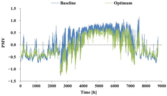 Comparison of the PMV index for the baseline and optimum renovation scenarios.