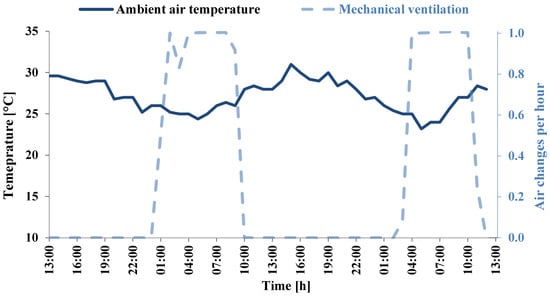 - Mechanical ventilation for cooling with a summer-period operation and an internal minimum air temperature setpoint of 24 °C [39] and an external maximum air temperature setpoint of 26 °C, increasing the air change rate by up to 1.0 ach. More specifically, the mechanical ventilation system is activated only when the indoor air temperature is over 24 °C and the ambient air temperature is under 26 °C, meaning that it does not surpass the setpoint temperature of 26 °C the cooling period.