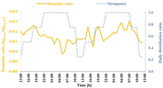 Humidity ratio of indoor air for the optimum renovation scenario compared to the daily occupancy distribution ratio.