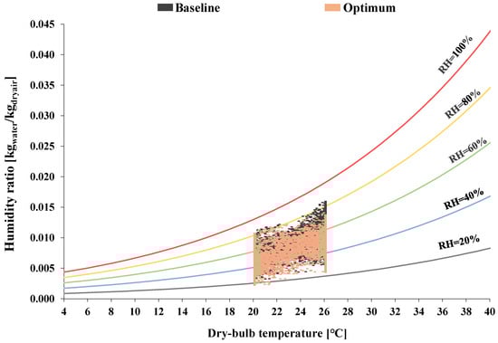 Finally, Figure 17 illustrates the psychrometric chart and the indoor air conditions for both the baseline and optimum renovation scenarios. The indoor air dry-bulb temperature is in the range of 20 °C and 26 °C, while the relative humidity is roughly between 20% and 70%. These values confirm that indoor thermal comfort conditions are within the desired comfort levels. These calculations also verify that the renovation scenario results in an increase in the indoor air relative humidity both in winter and summer.