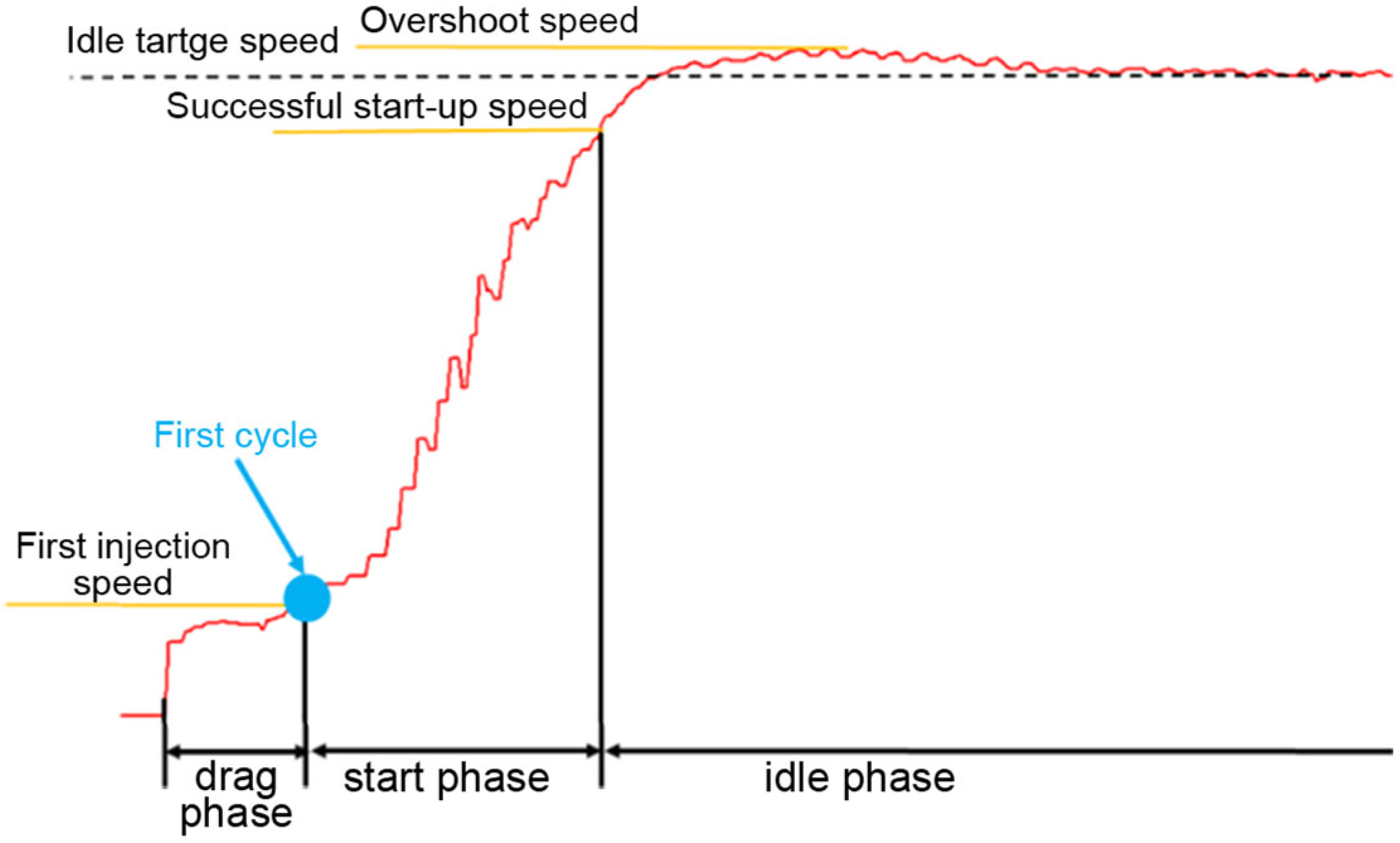 - Simulation calculations and analysis of the three node cycles of the starting process under different target acceleration curves show that appropriately increasing the fuel injection quantity can improve the thermal efficiency of the first cycle and the later cycles, with the former being more obvious and the mid cycle having basically no effect. The optimal target acceleration curve slope is k = −200. At this point, the calculated optimal fuel injection quantities for the first cycle under normal temperature start-up, low-temperature start-up, and cold start-up are 17.3 mg, 18.5 mg, and 20.4 mg, respectively.