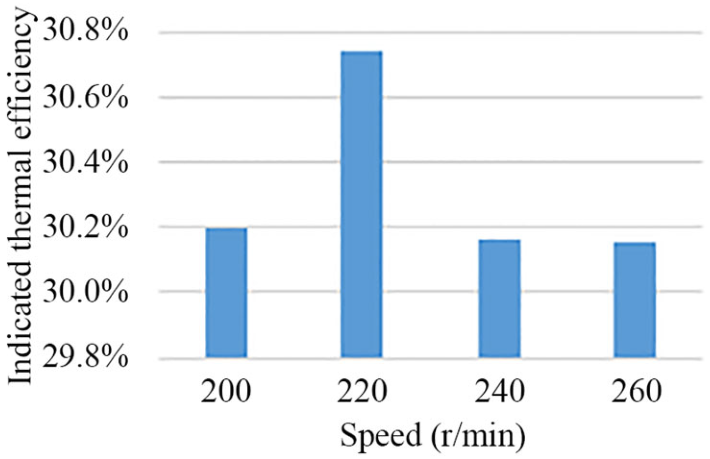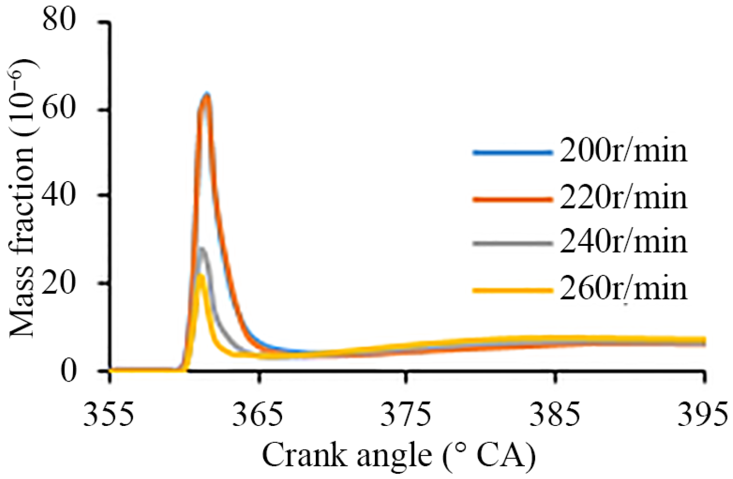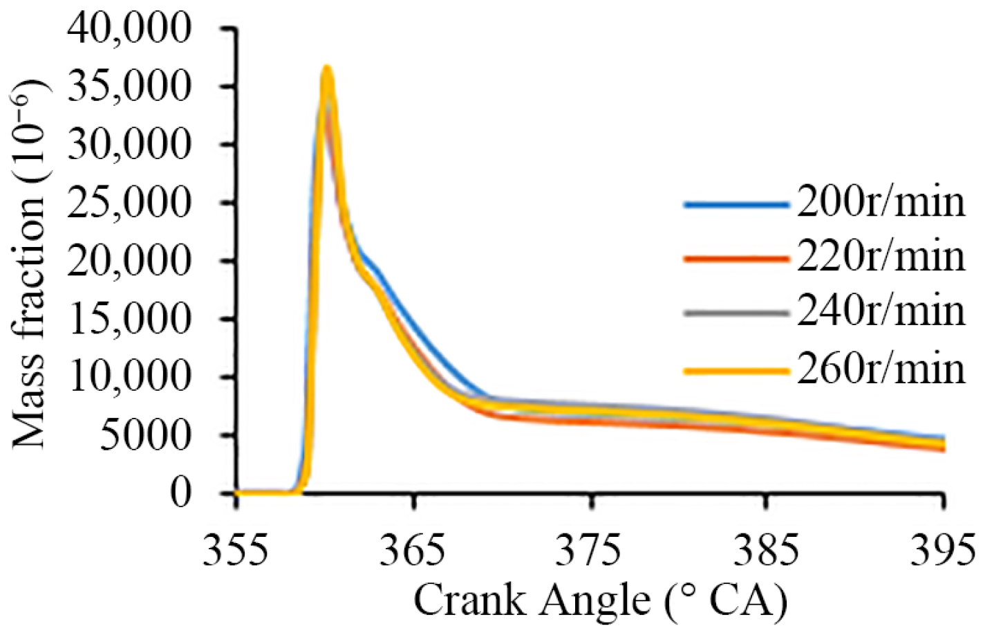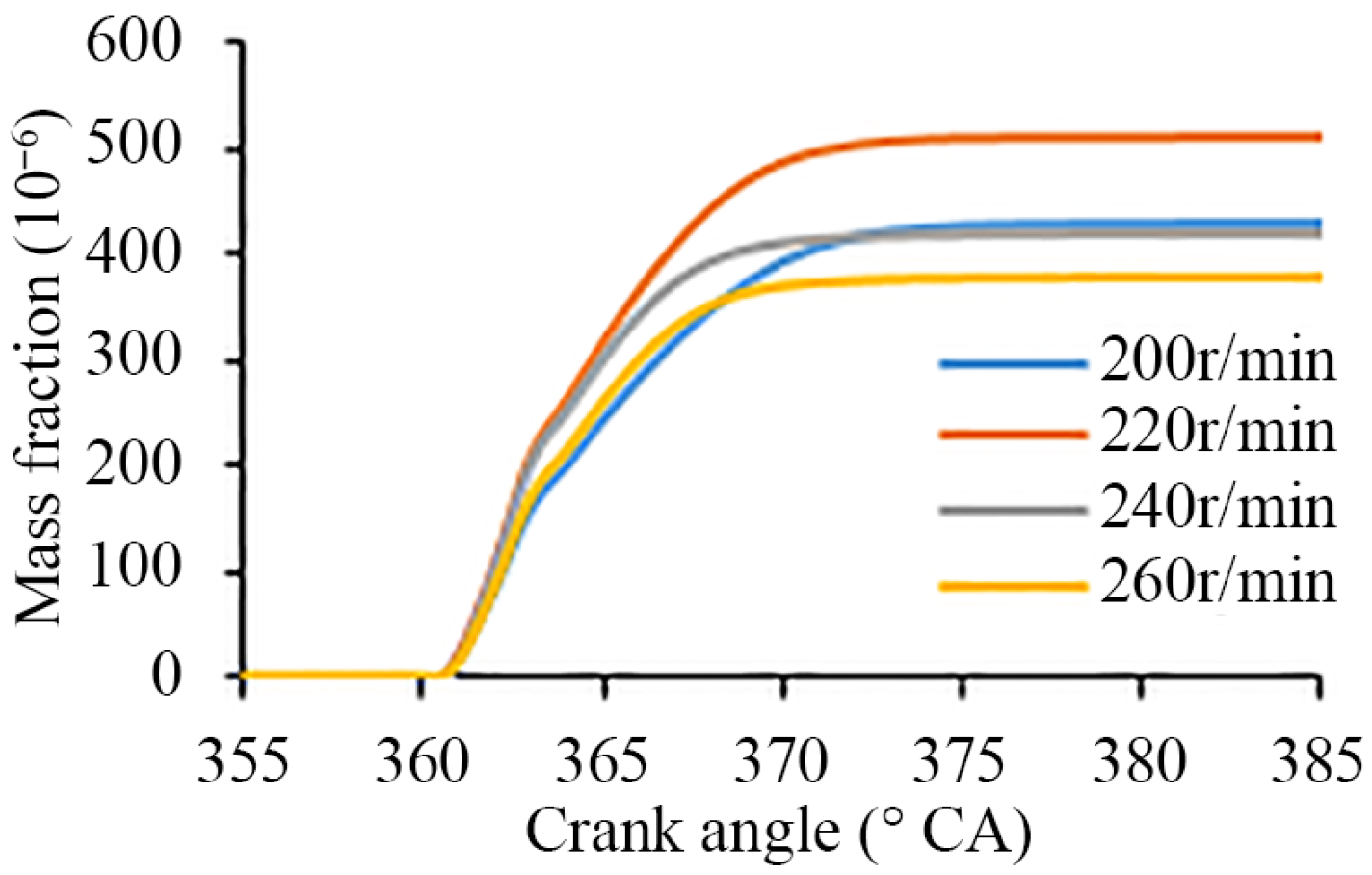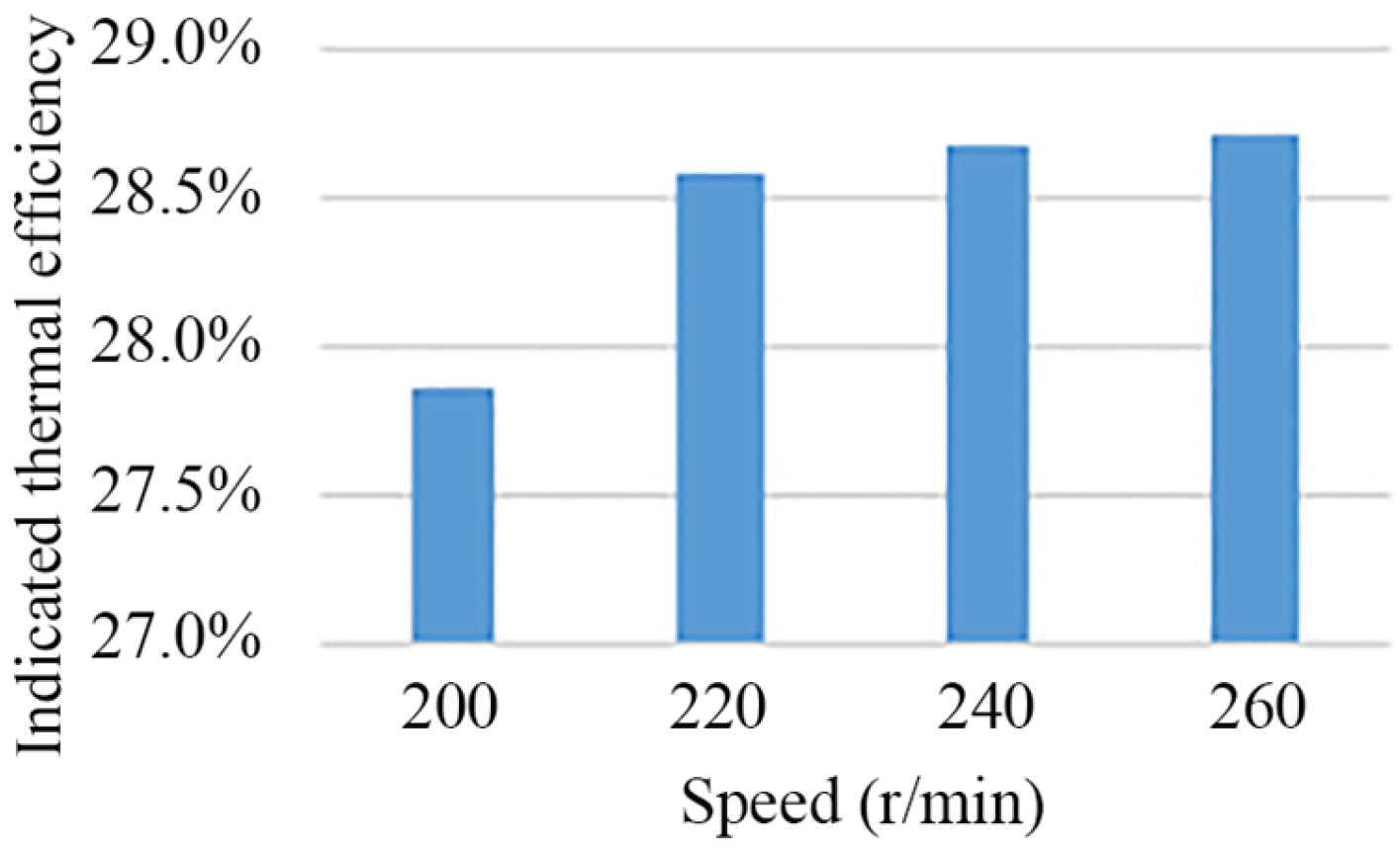 - When starting at normal temperature and low temperature, by comparing the effects on indicated thermal efficiency and emission levels, the optimal first injection speeds for the first cycle are selected as 220 r/min and 240 r/min, respectively. During cold starts, prolonged ignition delays occur due to temperature effects. Excessively high rotational speeds result in insufficient time for fuel–air mixture formation, leading to incomplete combustion. By comparing indicated thermal efficiency and emission performance, 220 r/min was determined as the optimal first injection speed for the first cycle.