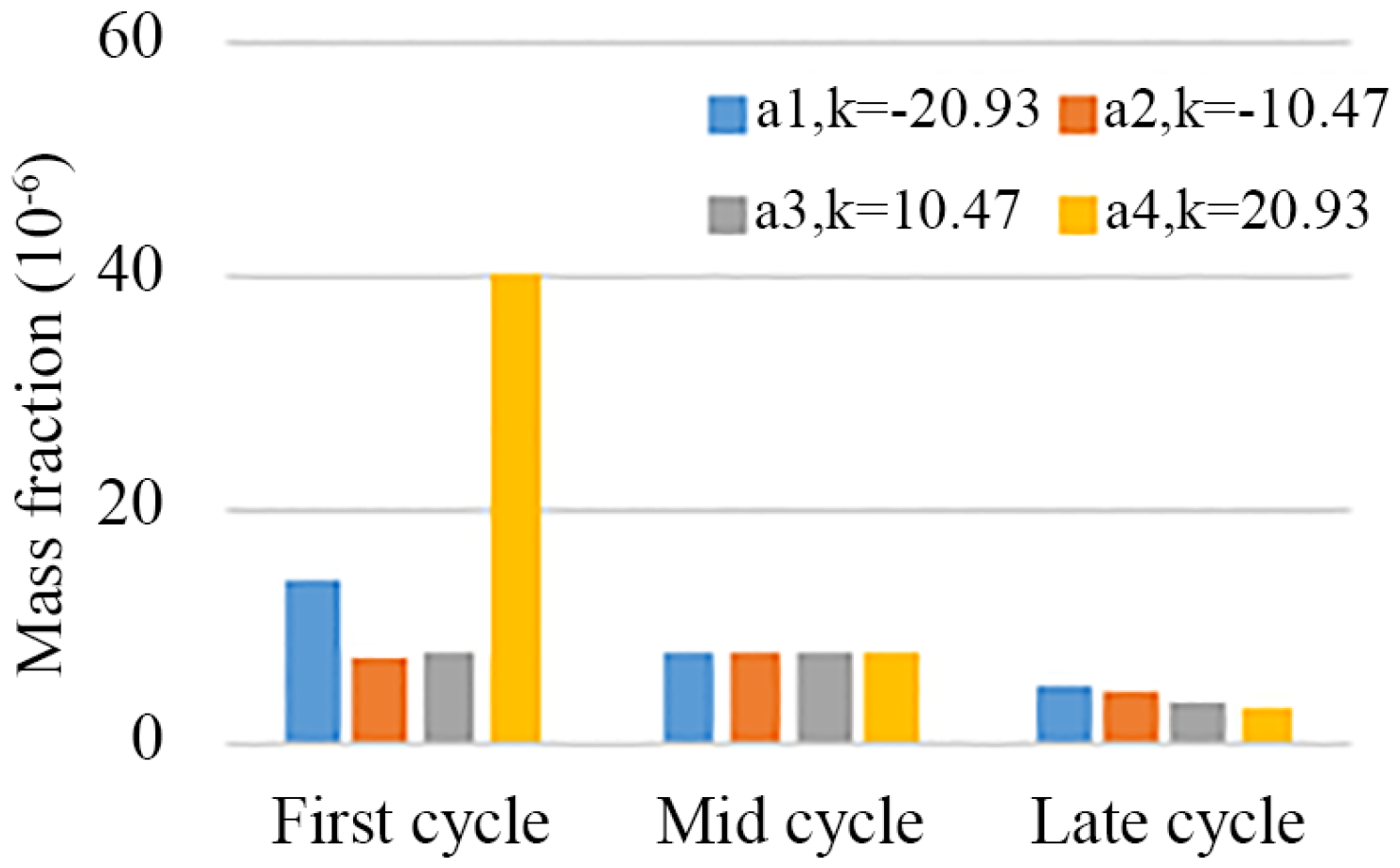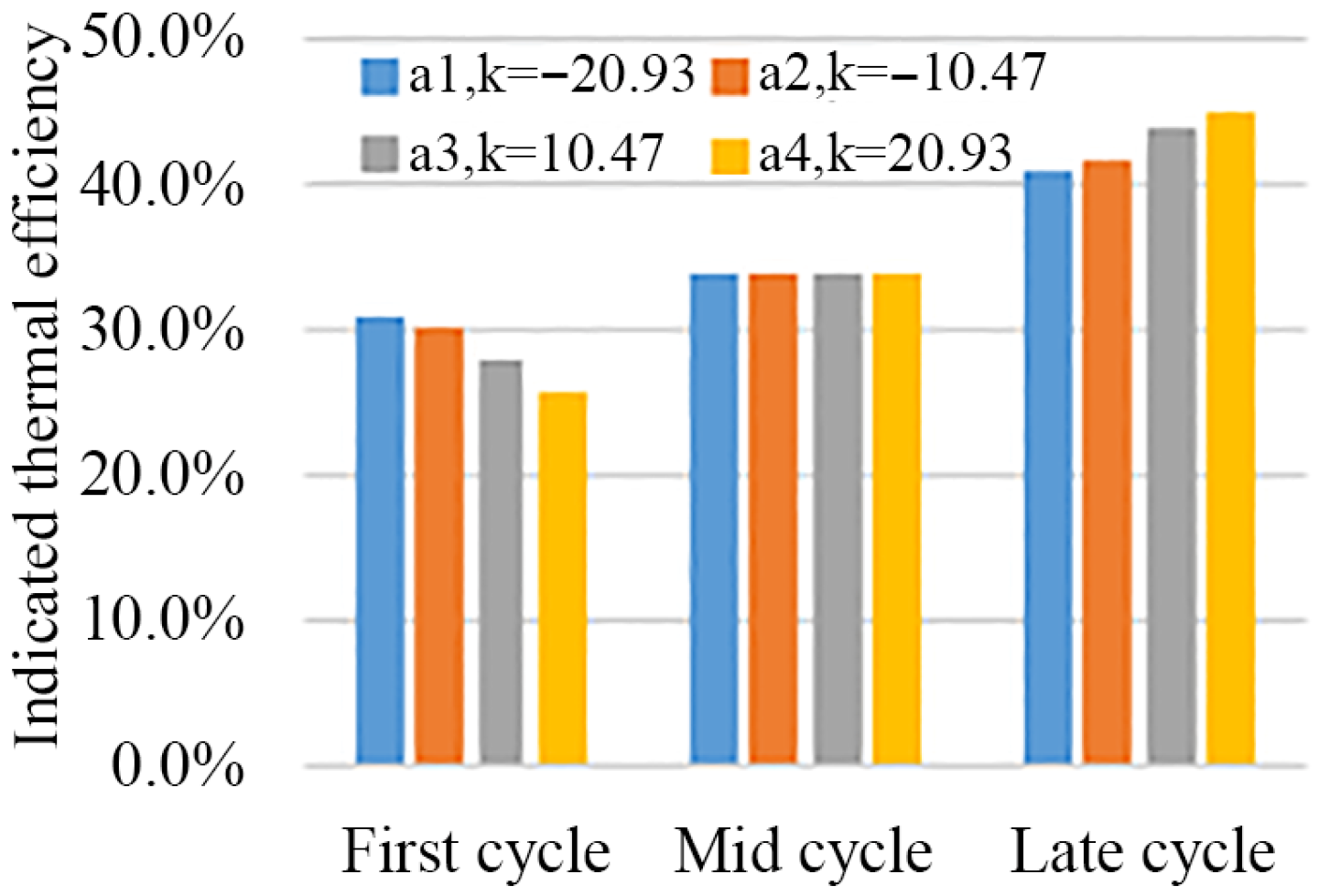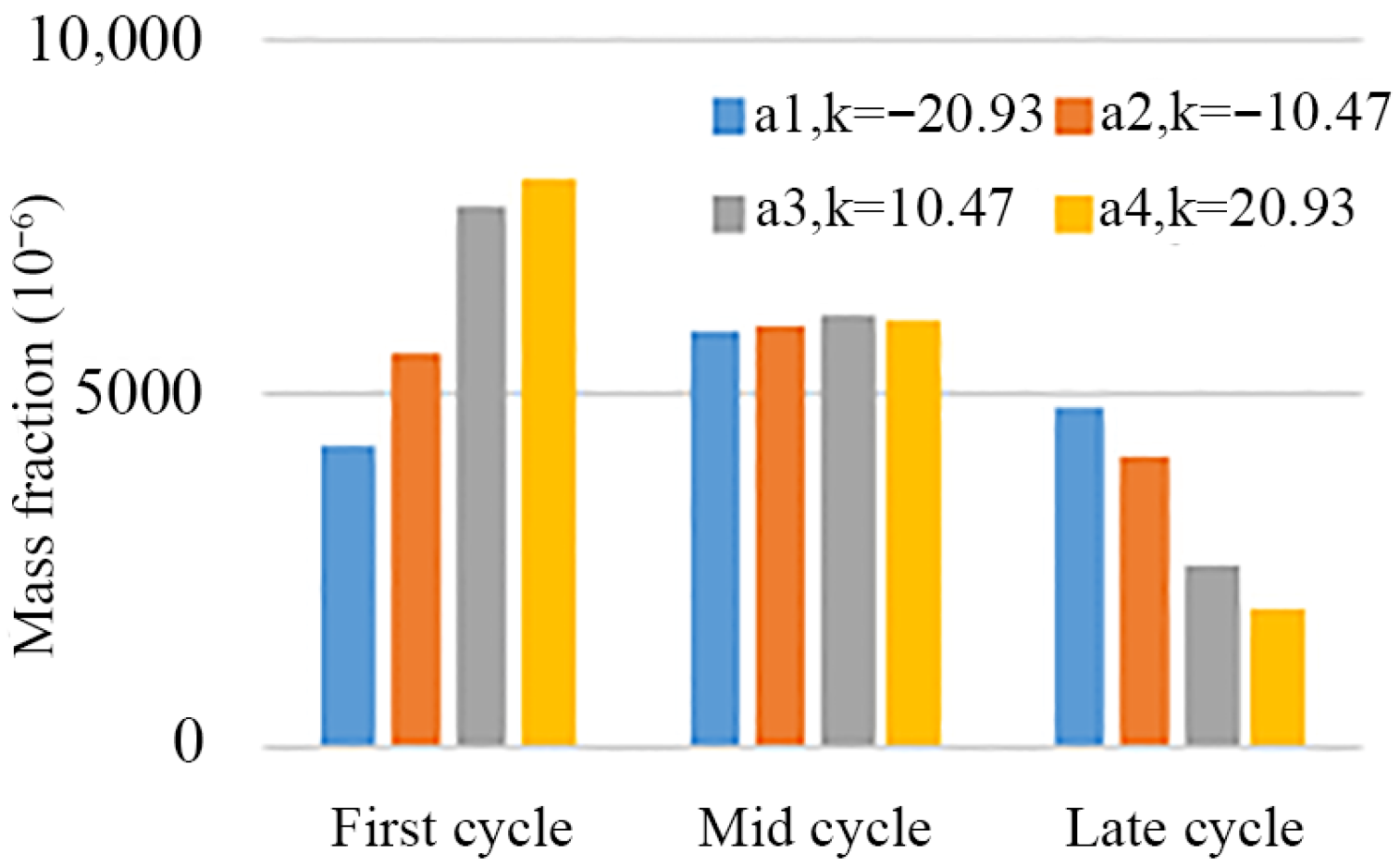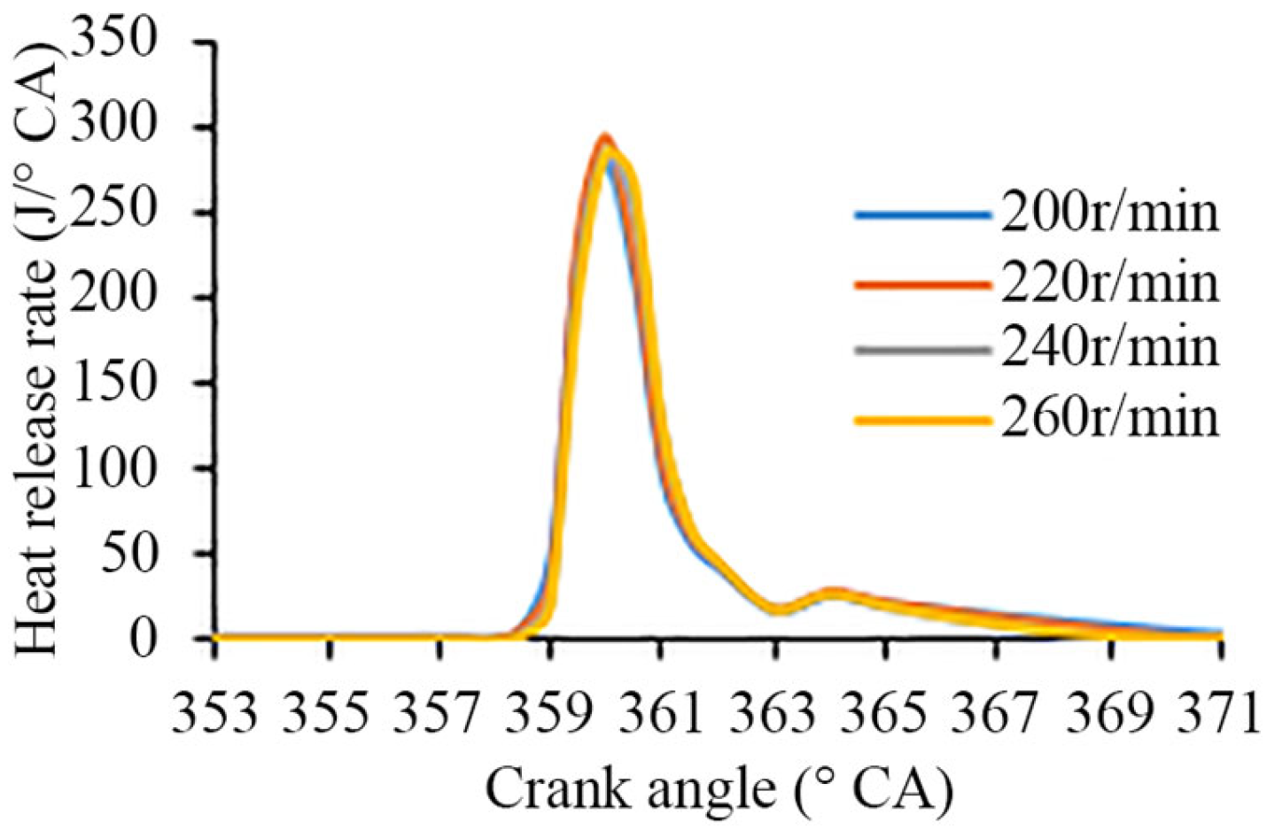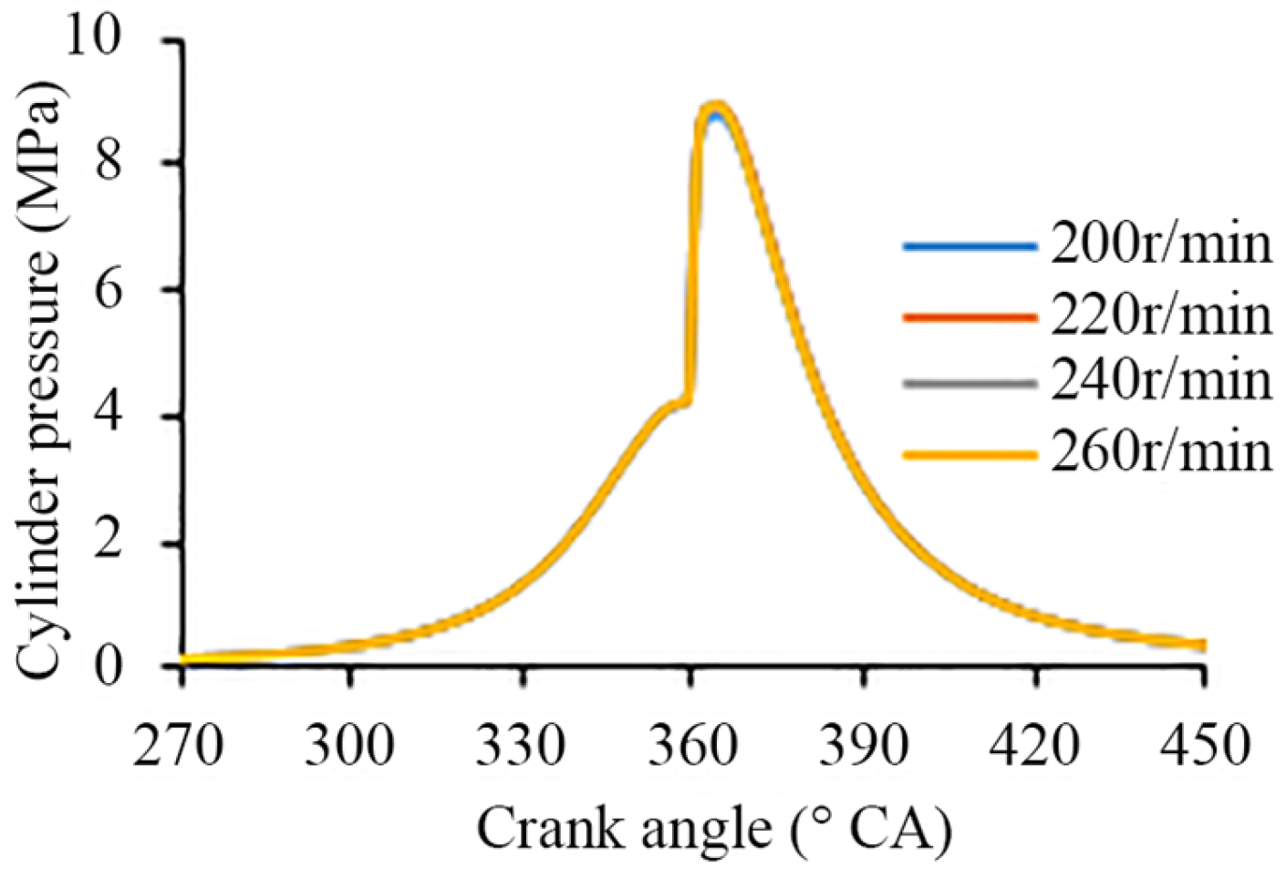 - When starting at normal temperature and low temperature, by comparing the effects on indicated thermal efficiency and emission levels, the optimal first injection speeds for the first cycle are selected as 220 r/min and 240 r/min, respectively. During cold starts, prolonged ignition delays occur due to temperature effects. Excessively high rotational speeds result in insufficient time for fuel–air mixture formation, leading to incomplete combustion. By comparing indicated thermal efficiency and emission performance, 220 r/min was determined as the optimal first injection speed for the first cycle.