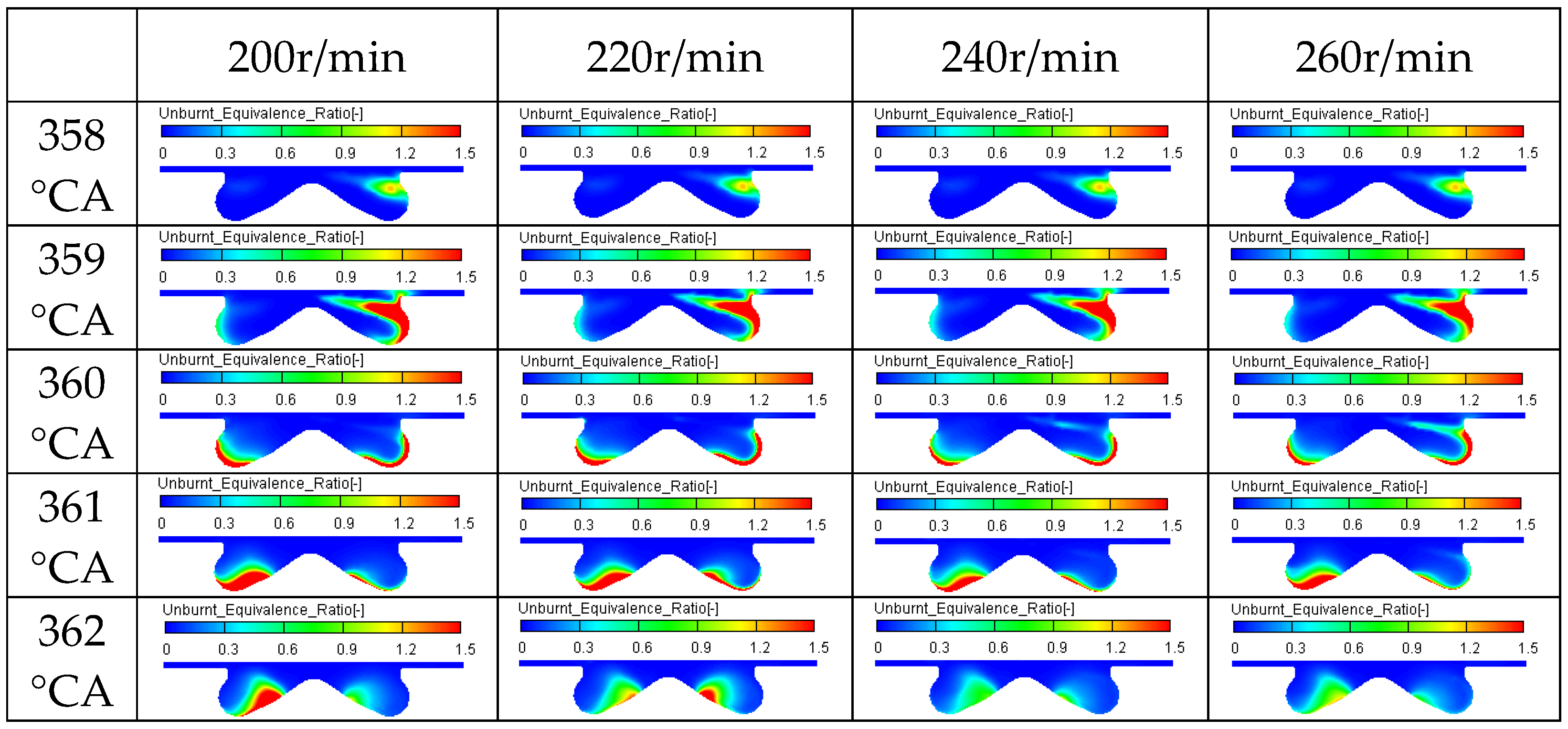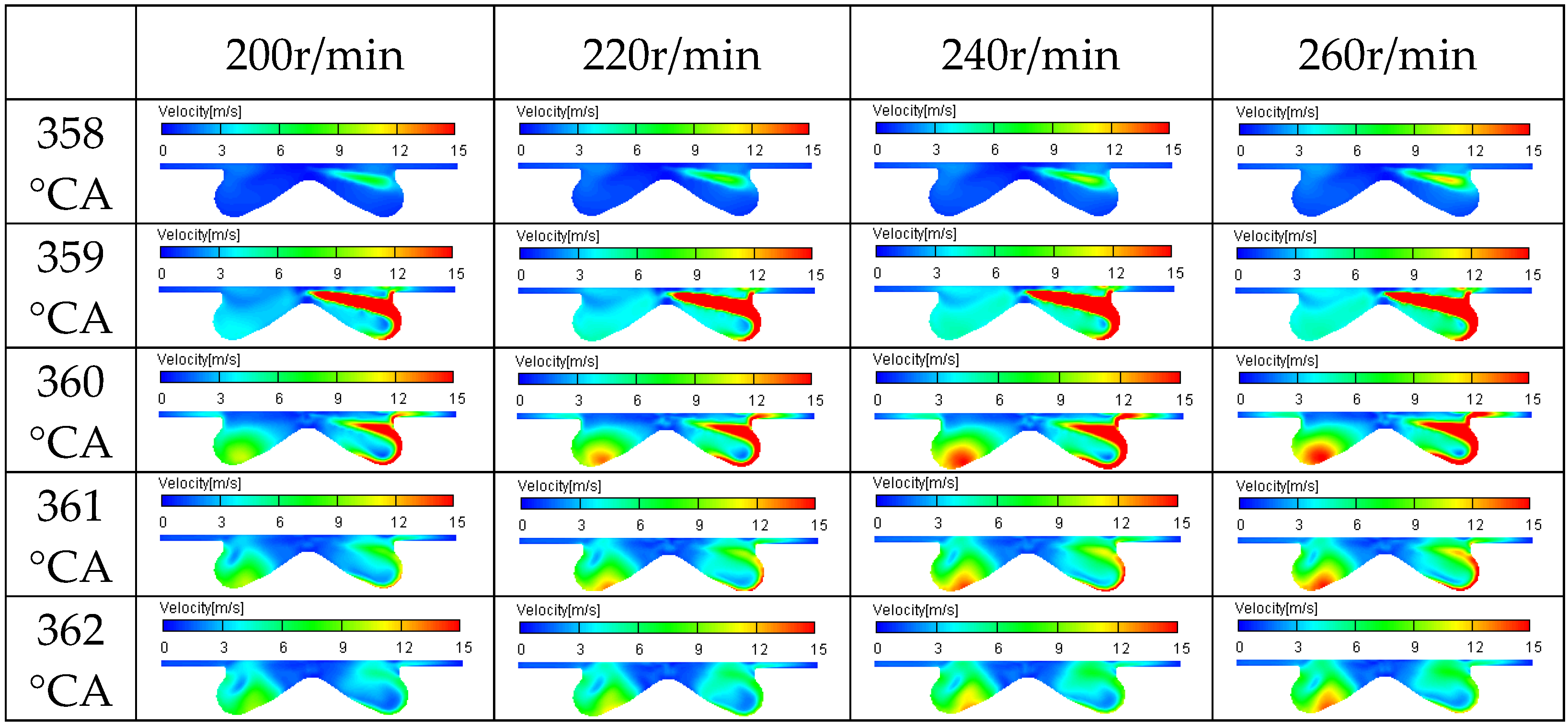 4.2. Effect of First Injection Speed on the Combustion Process and Emission Performance