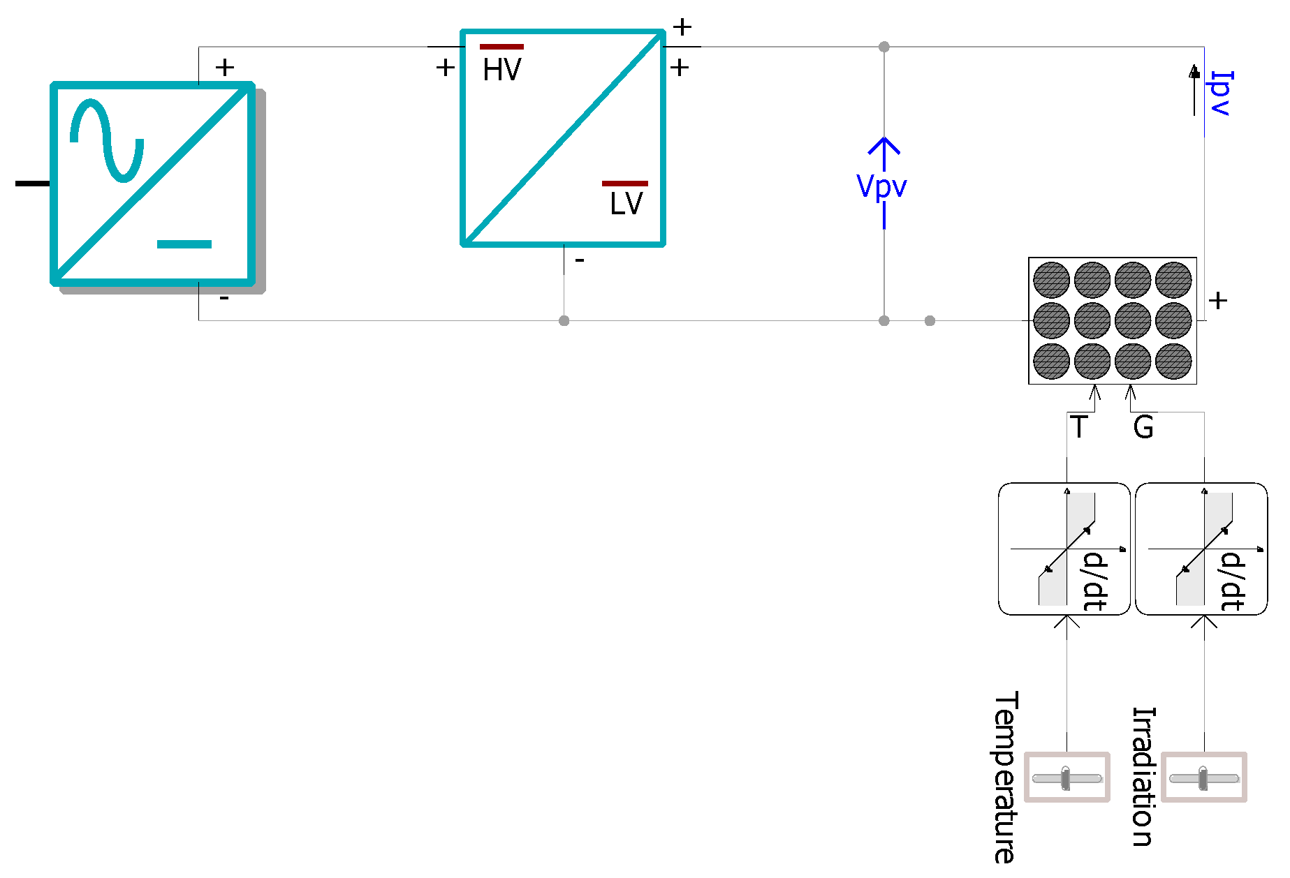 . These two variables are provided as external inputs through time-varying blocks, so that different irradiation and temperature profiles can be applied in the simulations. The array terminal voltage