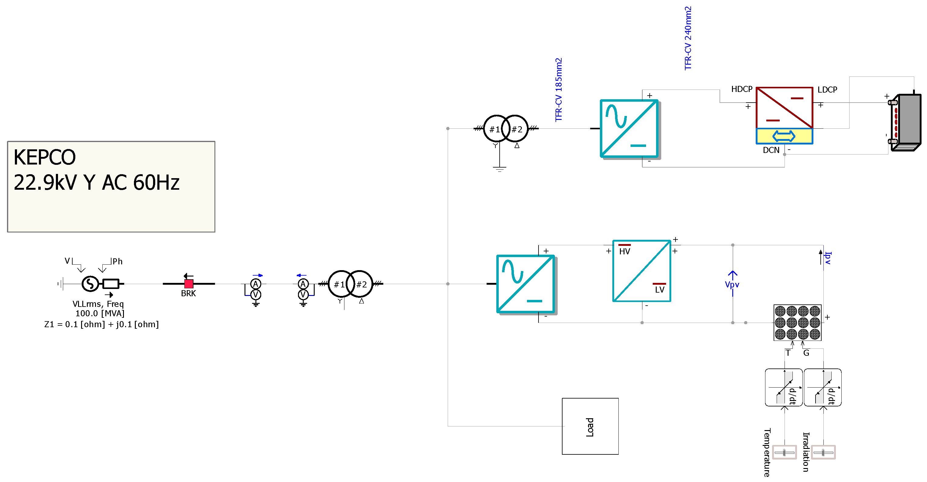 Figure 4 shows the complete PSCAD model of the BESS–PV microgrid as connected to the KEPCO distribution system. As shown in