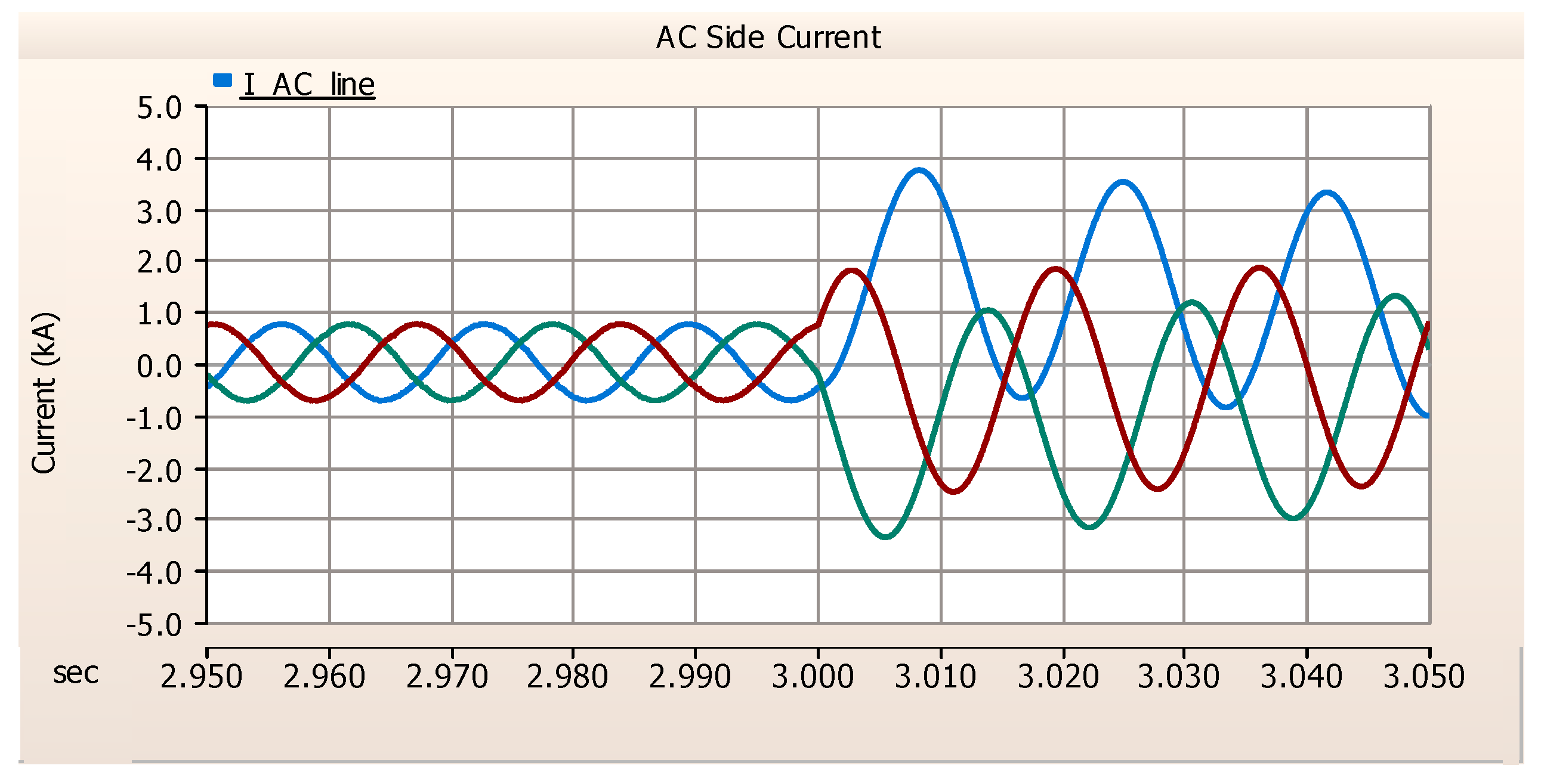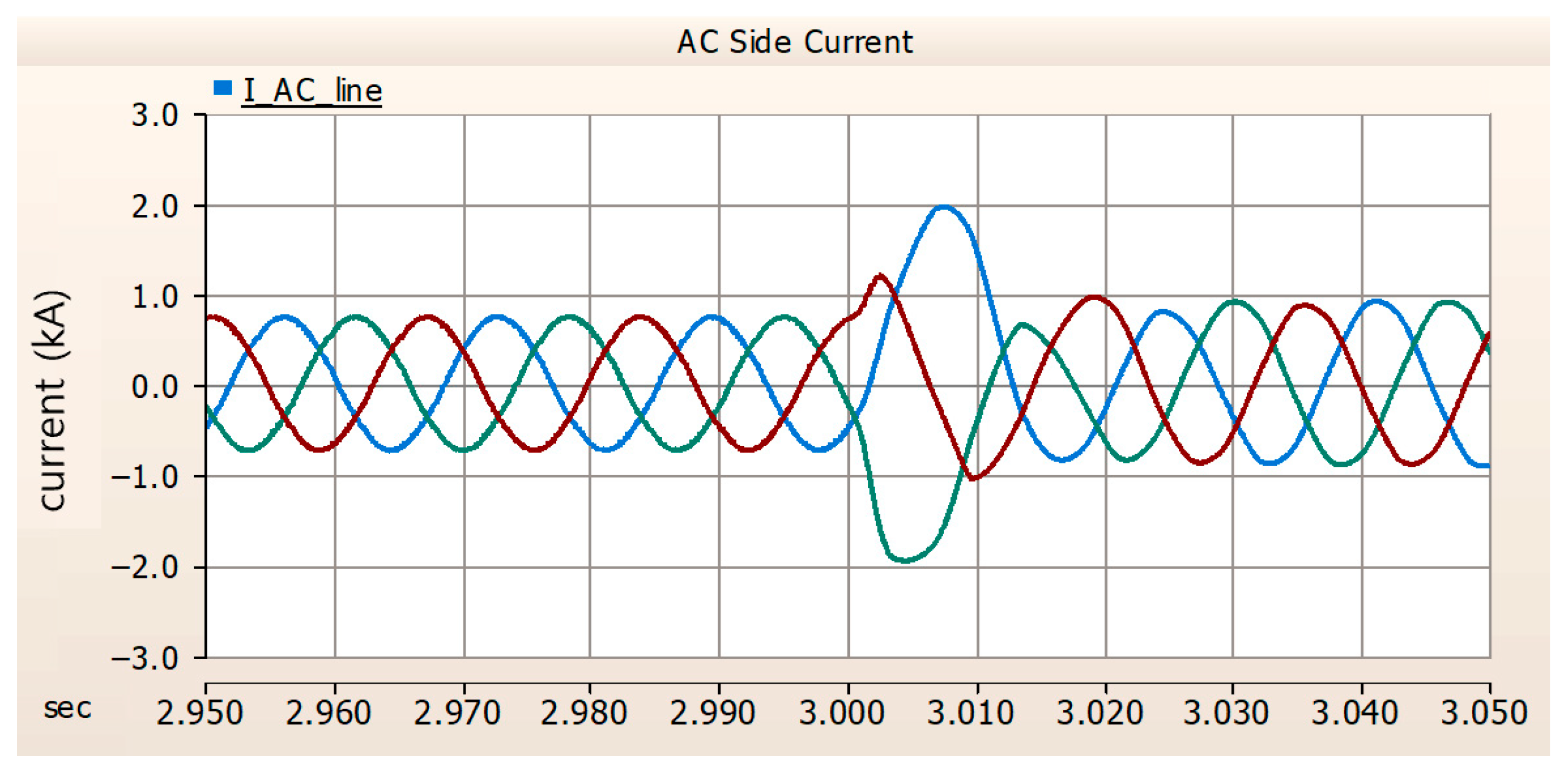 Figure 9 shows the three-phase AC line currents at the converter terminals for the same DC pole-to-pole fault. The waveforms for Phase A, Phase B, and Phase C are represented by blue, green, and red lines, respectively. Prior to the fault, the A-phase, B-phase, and C-phase currents are balanced sinusoidal waveforms. Immediately after the fault at