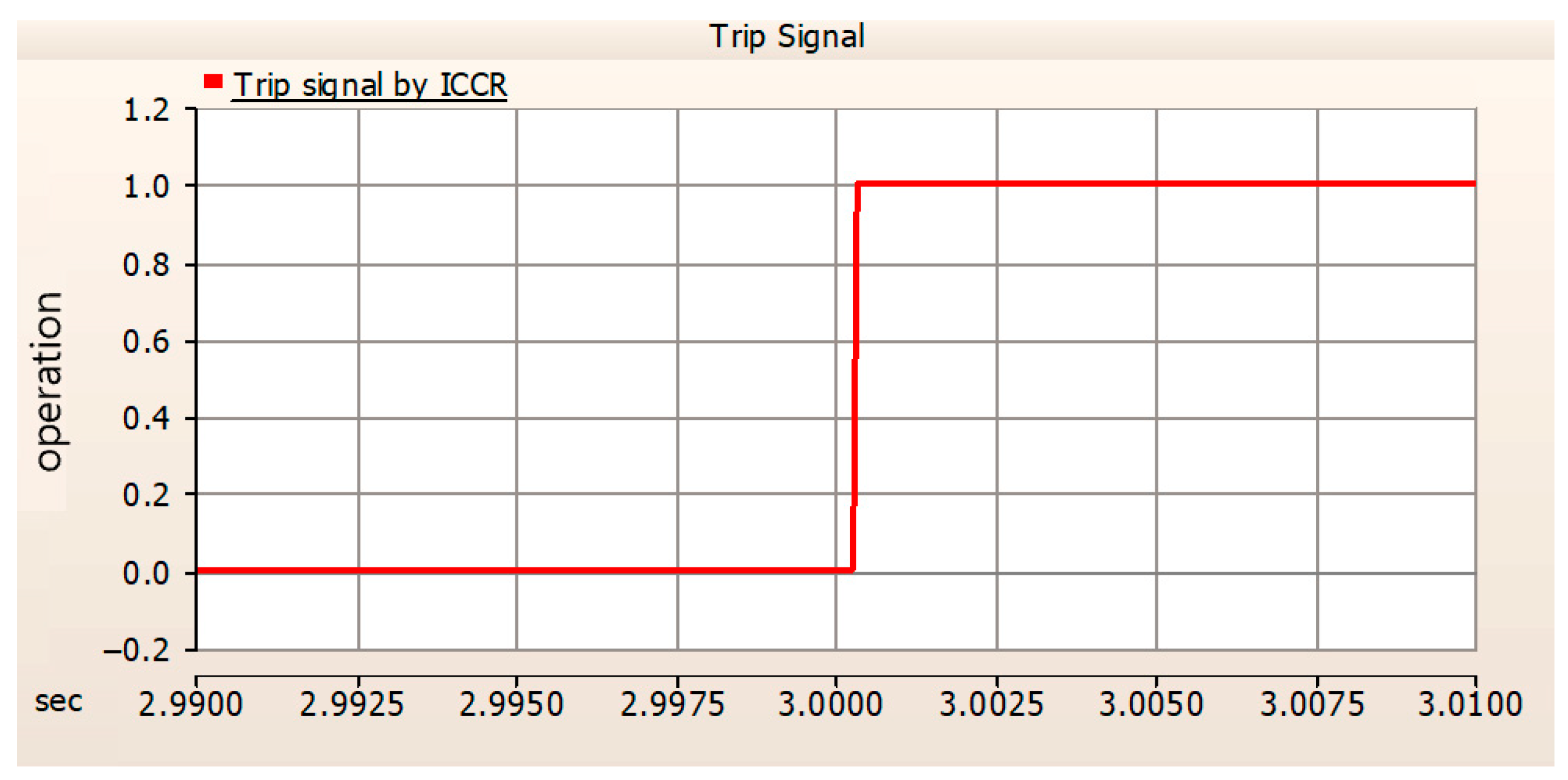 Figure 12. As soon as the ICCR exceeds the threshold for the required number of consecutive samples, the counter condition is satisfied and the trip signal changes from 0 to 1. In this case, the ICCR threshold is reached and a trip command is issued 0.342 ms after the fault occurs, demonstrating that the proposed ICCR-based protection can detect DC pole-to-pole faults within a sub-millisecond time frame.