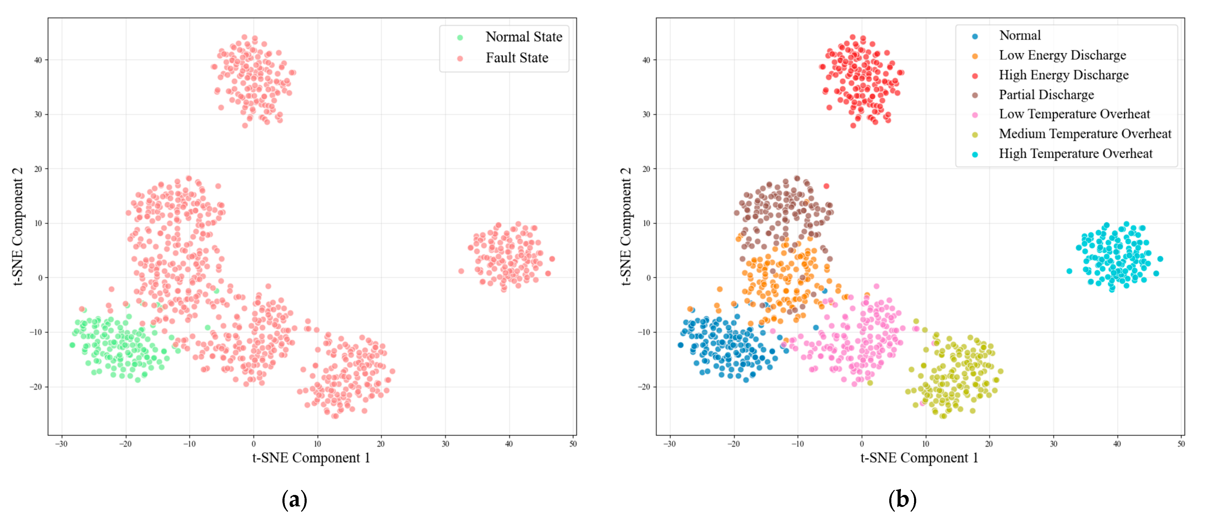 Figure 2 provides a more refined classification display of fault types, presenting the distribution of seven specific states via t-SNE. It can be observed that the normal state maintains its compact clustering feature, while various fault states exhibit different distribution patterns. Among them, the sample points for certain fault types, such as partial discharge (PD) and low-energy discharge (LD), show partial overlap with relatively ambiguous boundaries, suggesting that these faults may share similar physical characteristics. Other fault types, like PD and different levels of overheating, demonstrate relatively independent distribution regions, indicating that these fault types possess good separability within the feature space.