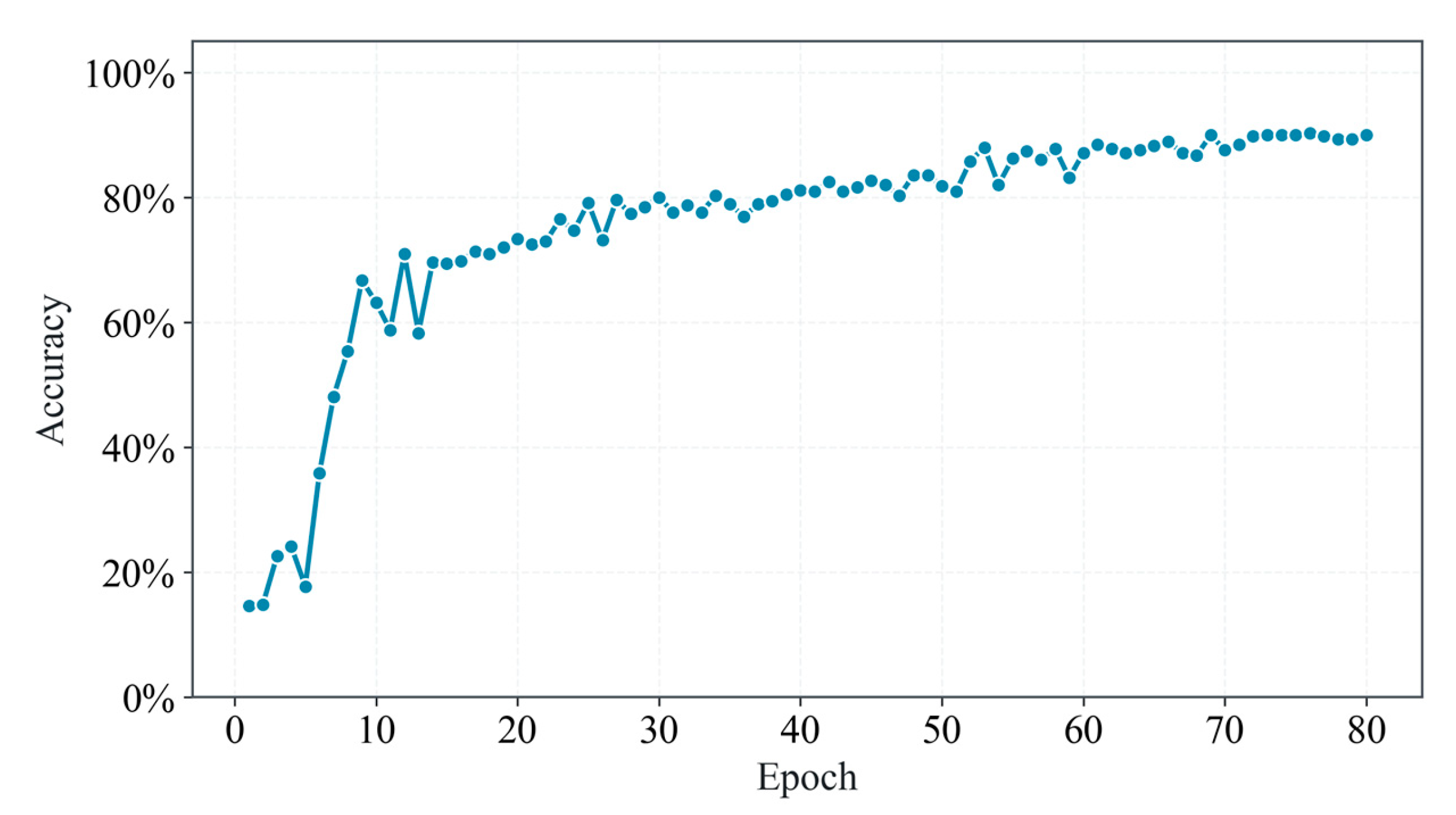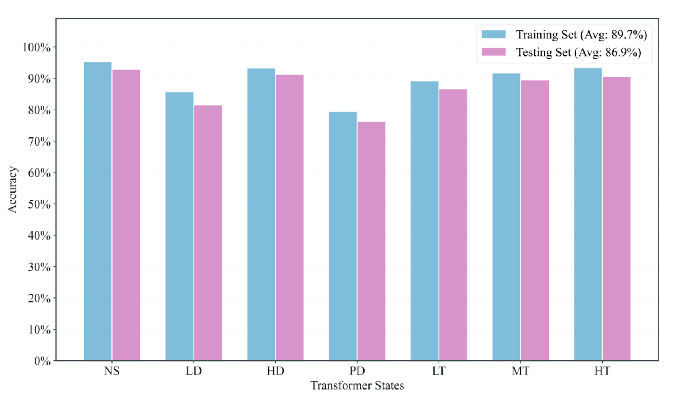 Figure 3, the average discrimination accuracy of the proposed PI-Transformer method for the seven transformer states reached 87.5% as the number of epochs increased.
