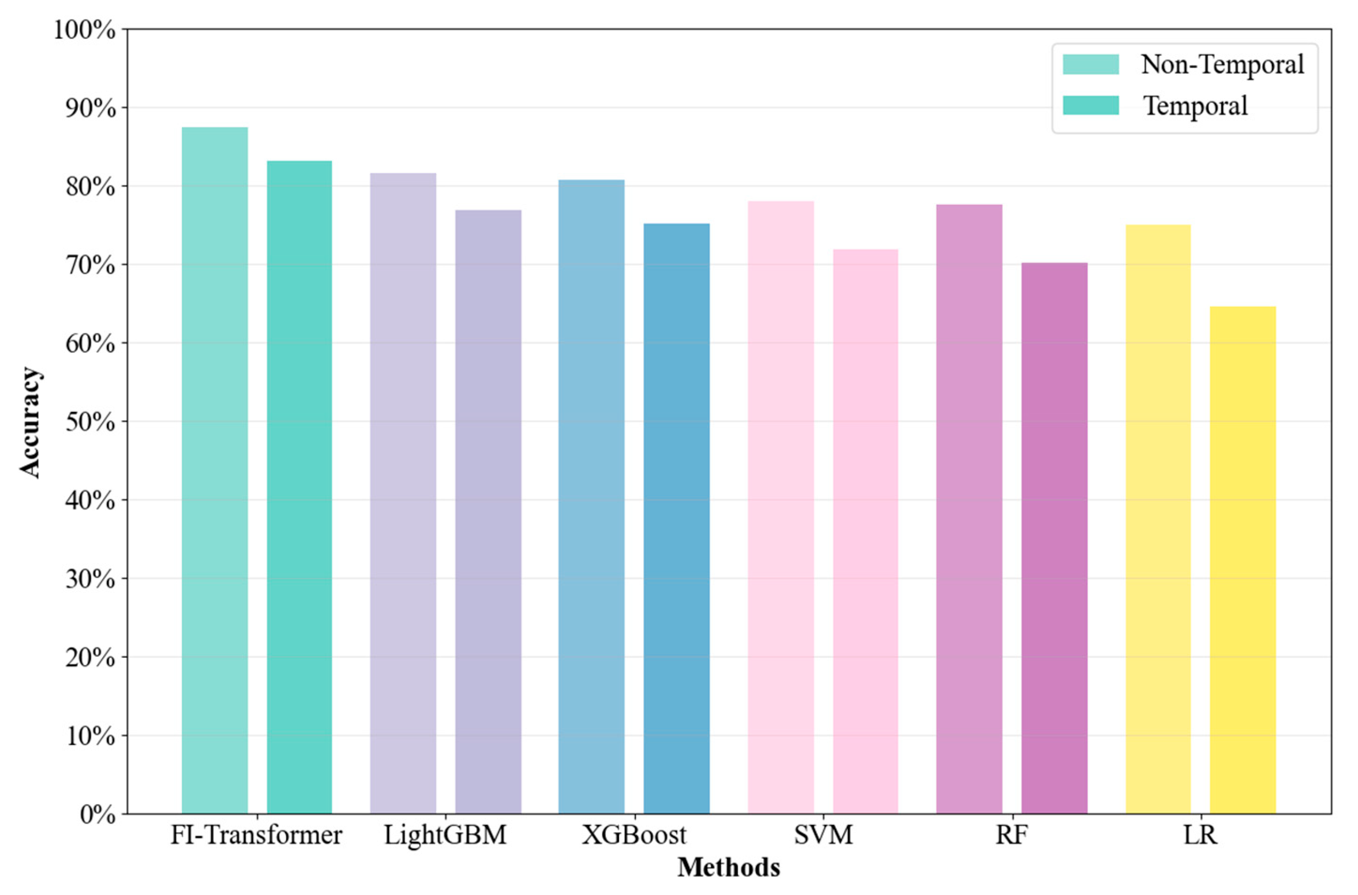 Gradient boosting methods (LightGBM and XGBoost) demonstrate competitive performance across most fault types, with their accuracy tending to decrease when distinguishing faults with ambiguous boundaries. Traditional strong classifiers, such as Random Forest and SVM, perform reliably on simpler fault types but show limitations in capturing complex fault patterns. Logistic Regression exhibits relatively lower overall performance due to its model complexity constraints, reflecting the inherent limitations of linear models in handling the nonlinear characteristics of transformer faults. These observations are consistent with the weighted average performance across multiple fault types and highlight the comparative advantages of the proposed PI-Transformer in multi-type fault diagnosis, as indicated by the overall trends in
