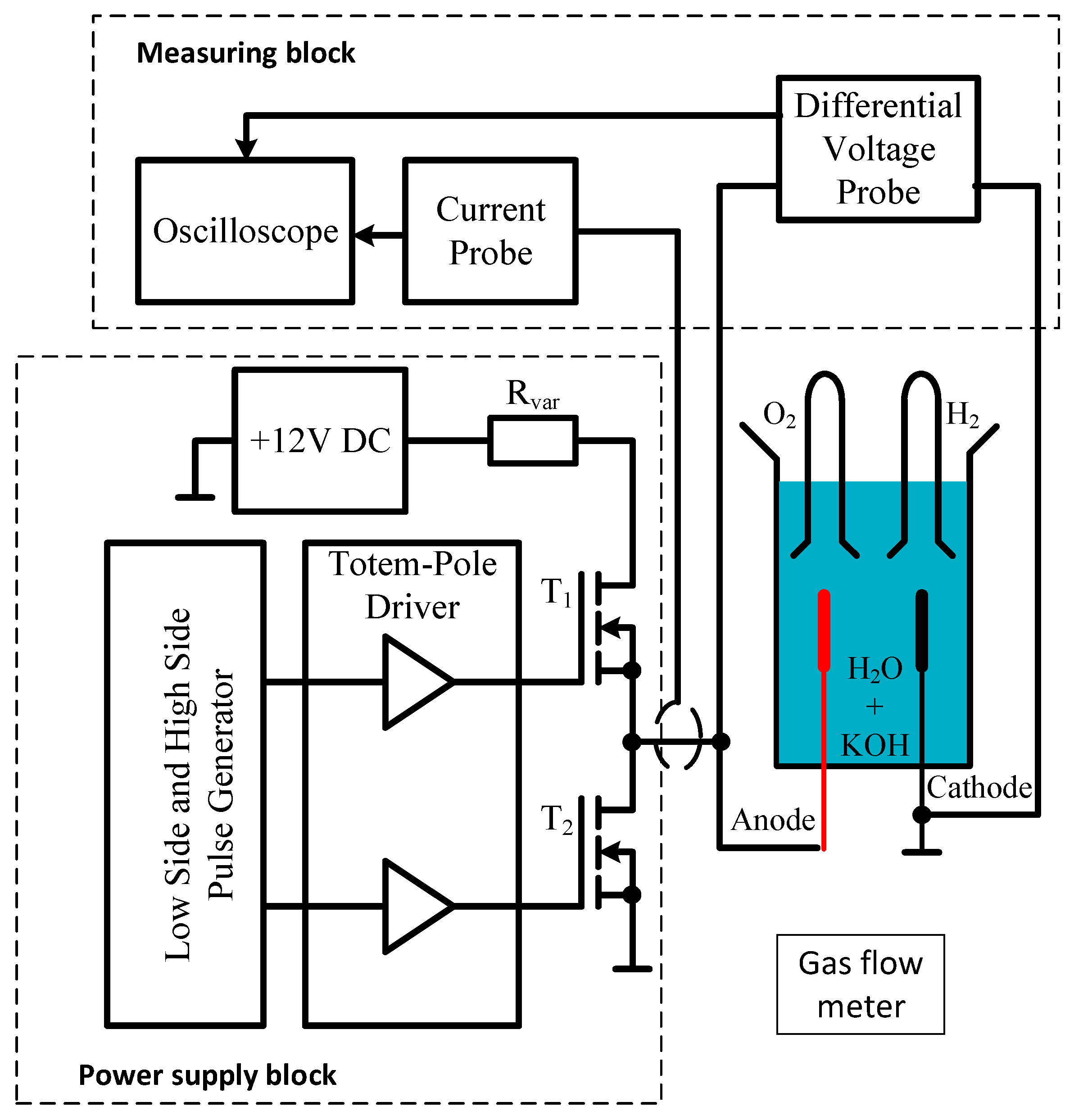 34], models of alkaline electrolyzers dedicated to the SPICE program were presented. However, these models were designed for use at low KOH concentrations and were not verified when supplied with a train of rectangular pulses with a high maximum value and a frequency varied over a wide range.