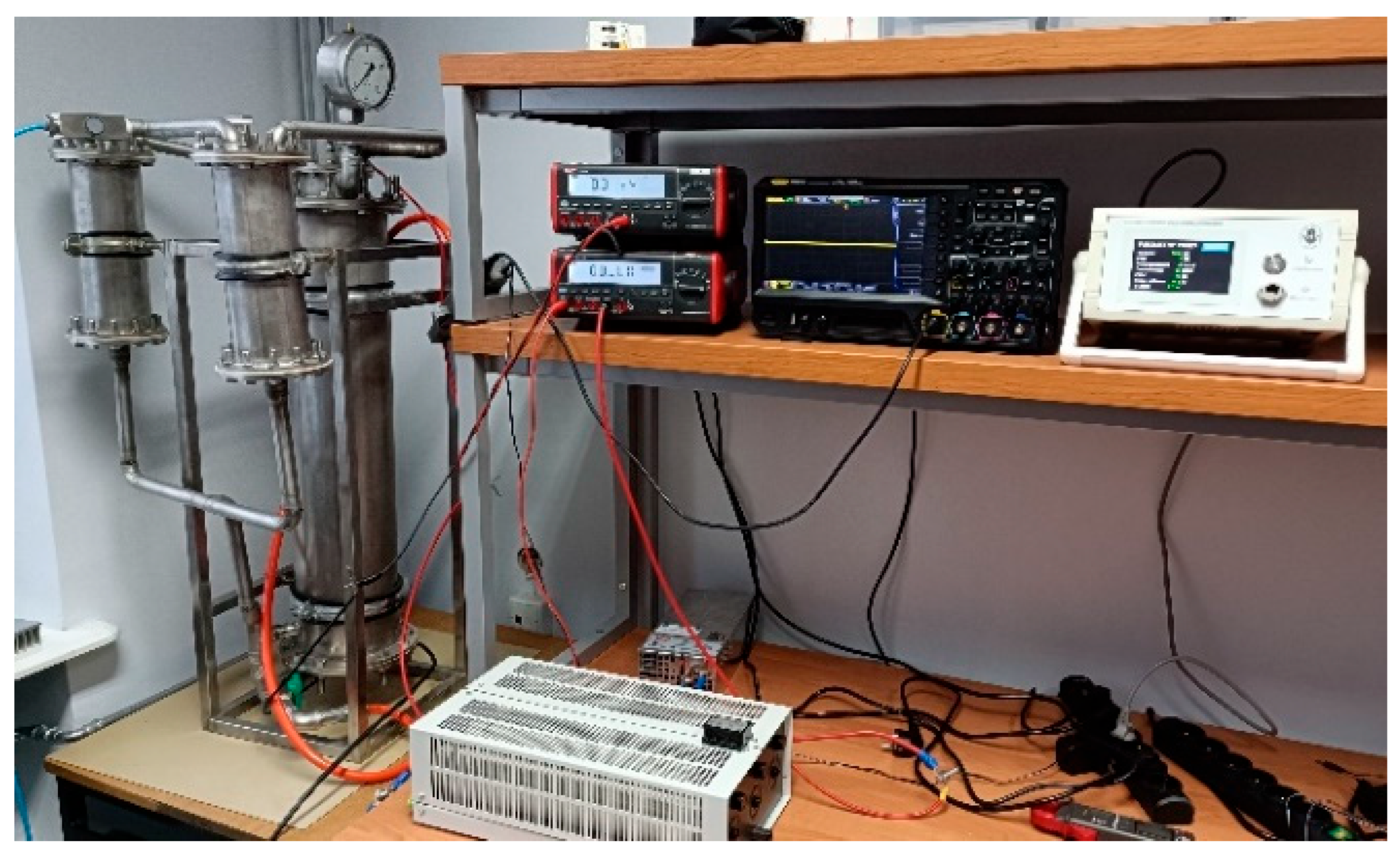 As can be observed, a good agreement was obtained between the calculation and measurement results. It is worth noting that at f < 50 kHz, the electrolyzer current assumes positive and negative values. This means that current flows through the electrolyte alternately in both directions. This may cause the produced hydrogen to mix with oxygen. It is also worth noting that after turning off the power supply, the voltage on the electrolyzer does not decrease to zero, but slowly decreases to a value exceeding 3 V. The minimum value of the voltage VE is an increasing function of frequency.