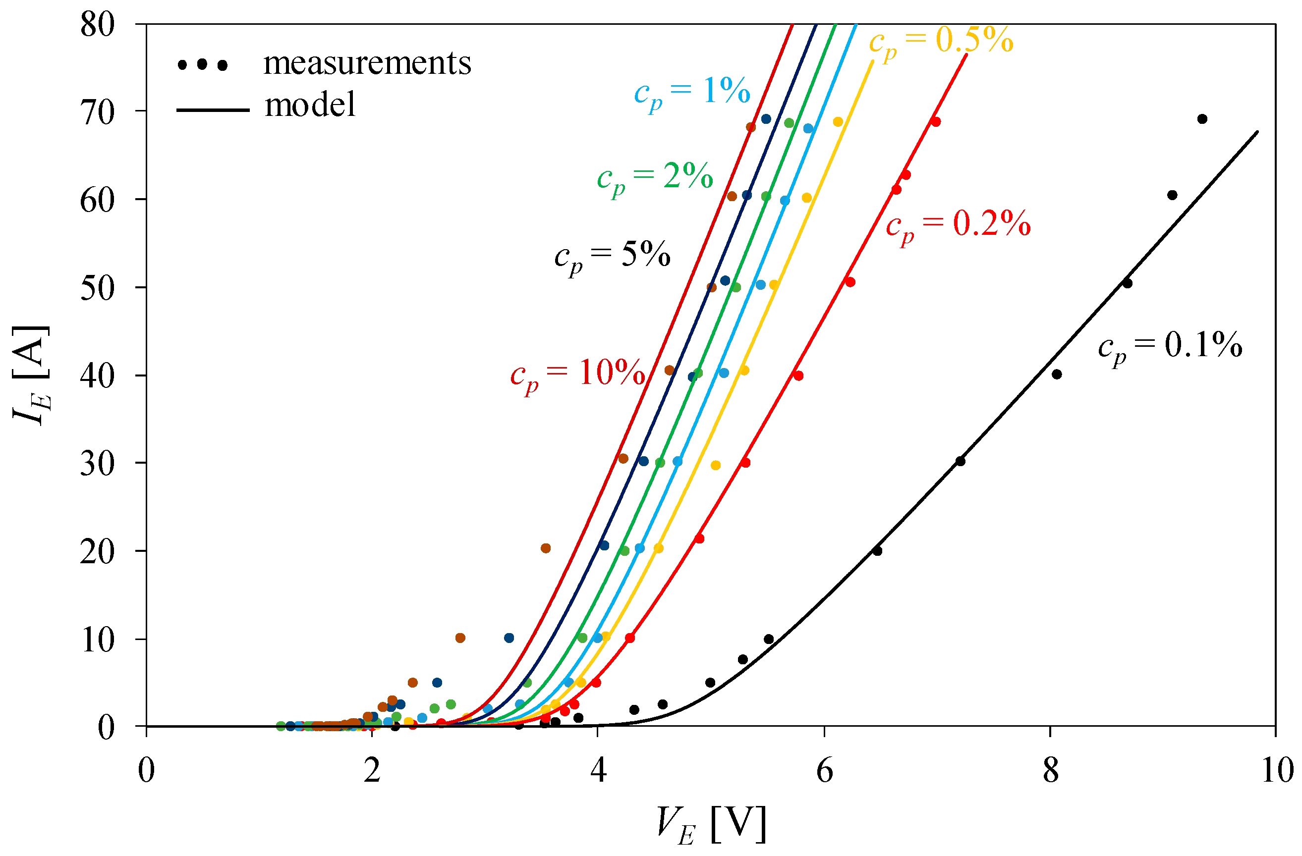 Figure 5, for virtually every electrolyte concentration, the calculation results model the measured characteristics well. The greatest discrepancy can be observed at higher solution concentrations (especially at concentrations of 5% and 10%) in the low-current range. An increase in electrolyte concentration c results in a drop in the electrolyzer voltage at a fixed supply current. As the