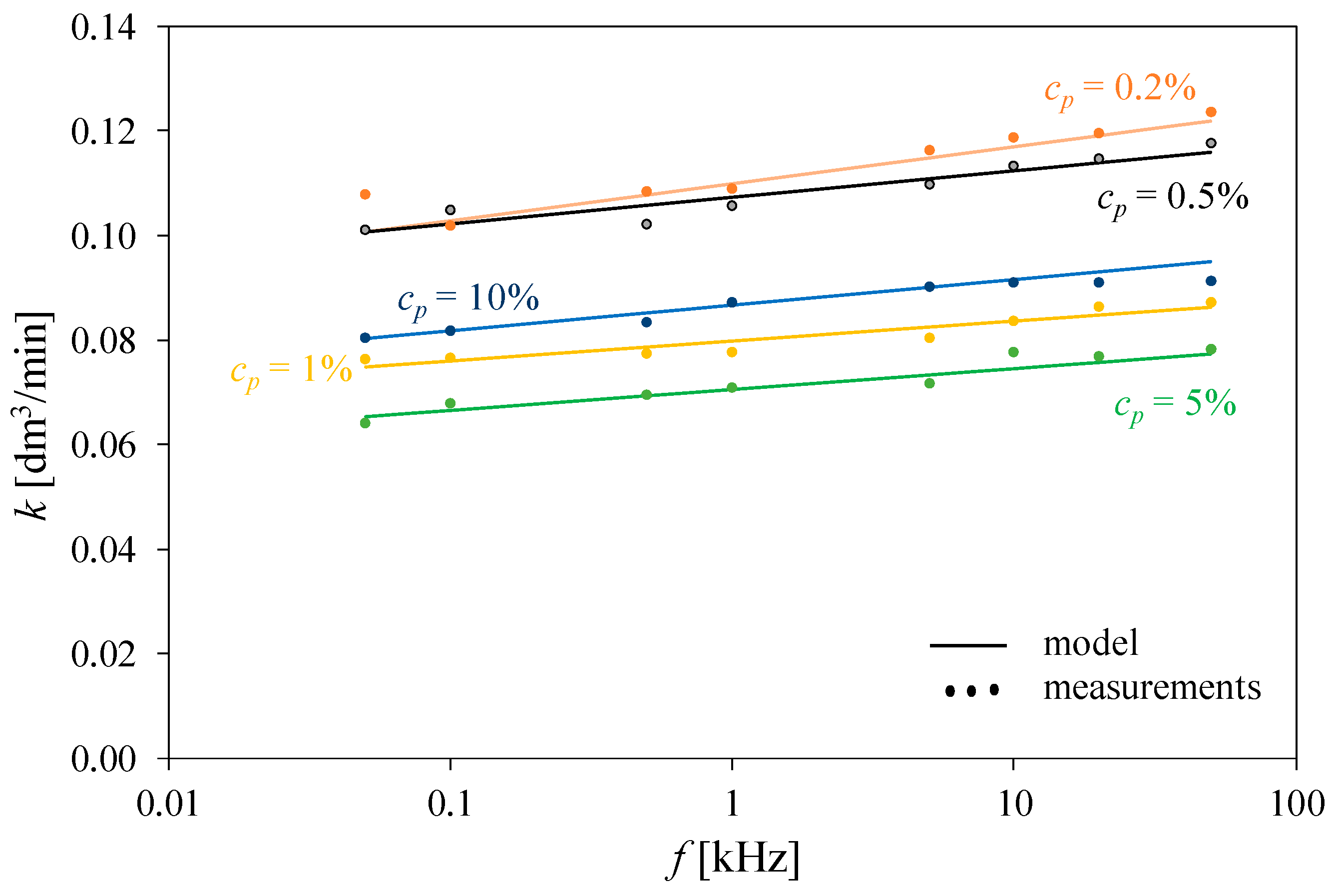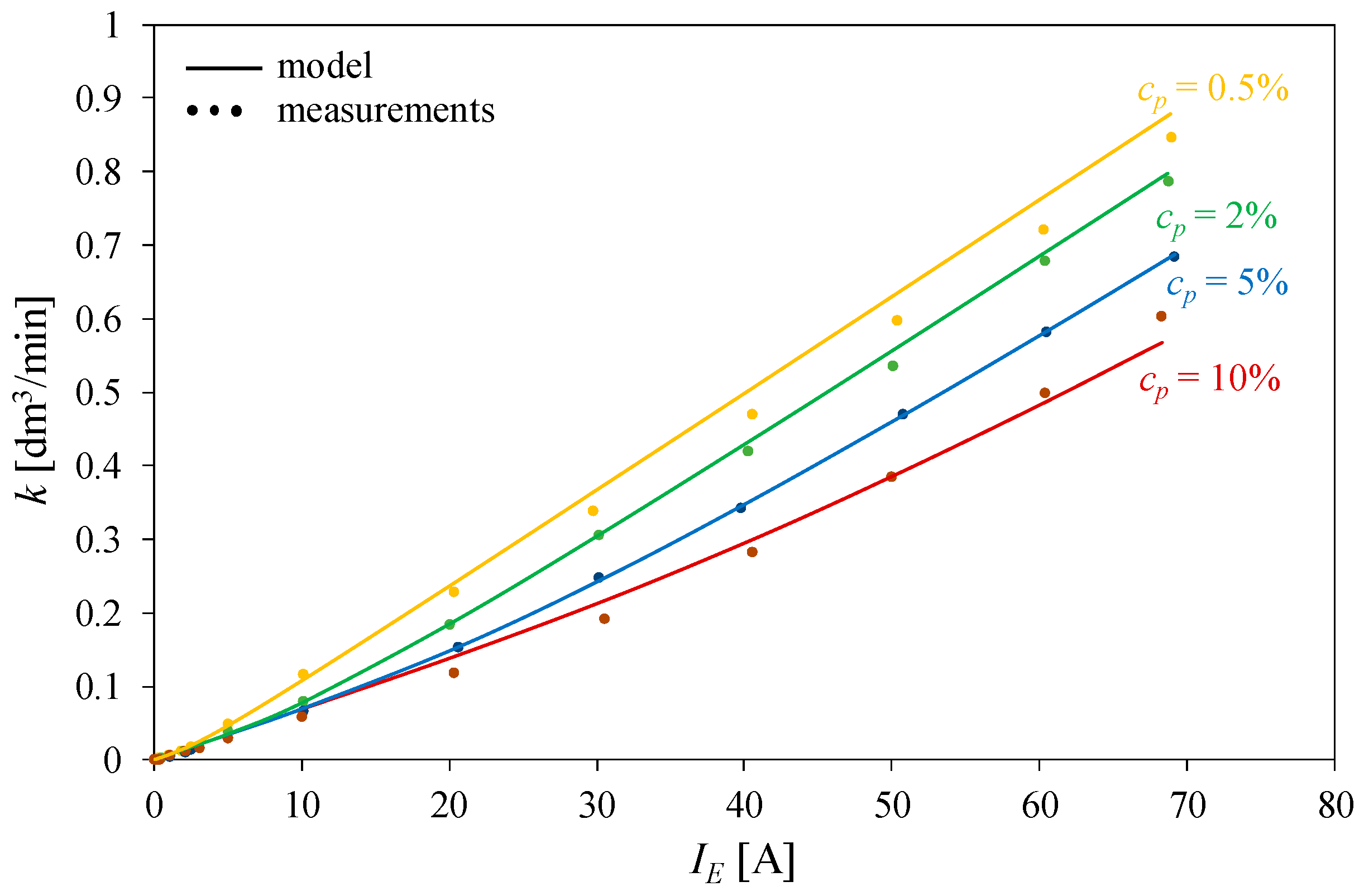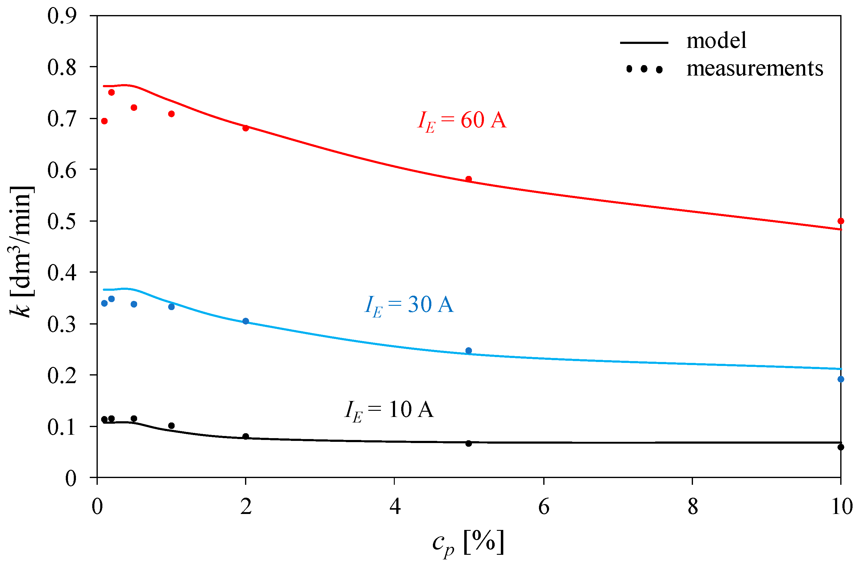 As can be observed, the flow rate is an increasing function of the current IE, while the k(cp) relationship has a maximum at cp in the range of 0.2 to 0.5%. The analytical description of the k(cp, IE) relationship proposed in this paper ensures good agreement between the calculated and measured results. The discrepancies between them do not exceed a few hundredths of a dm3/min. The value of MSE, normalized to maximum measured value of k, does not exceed 2.5%.