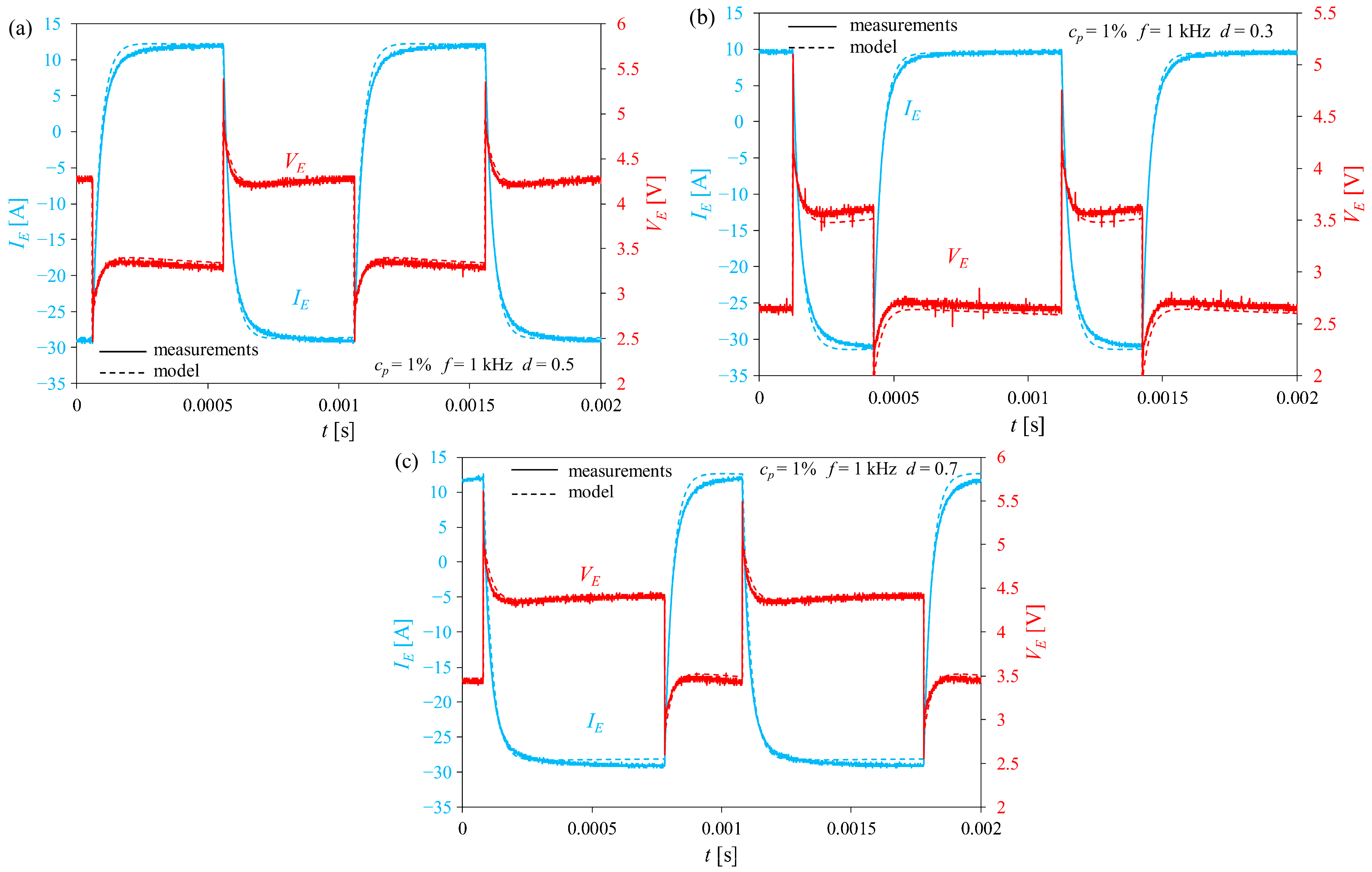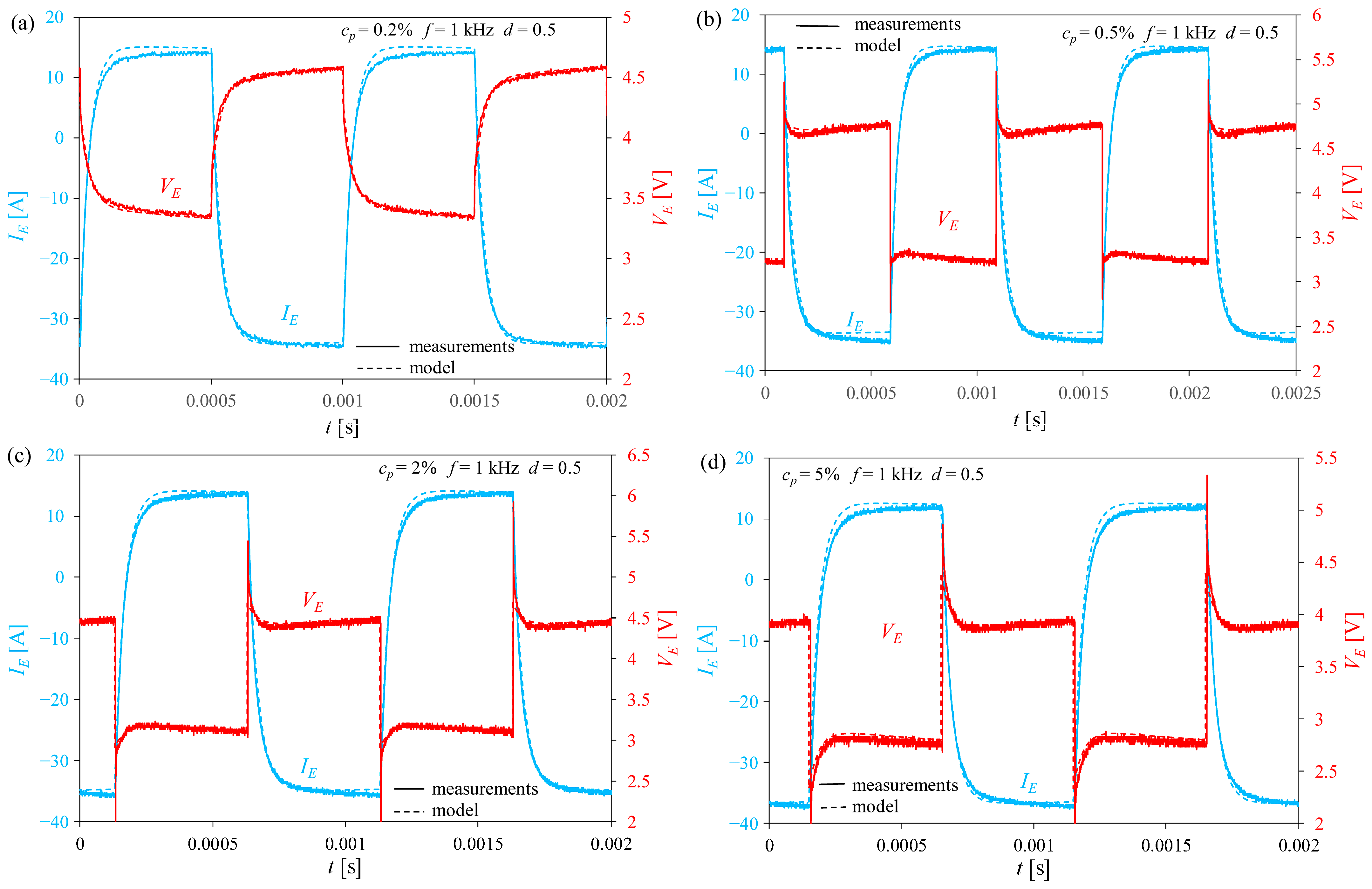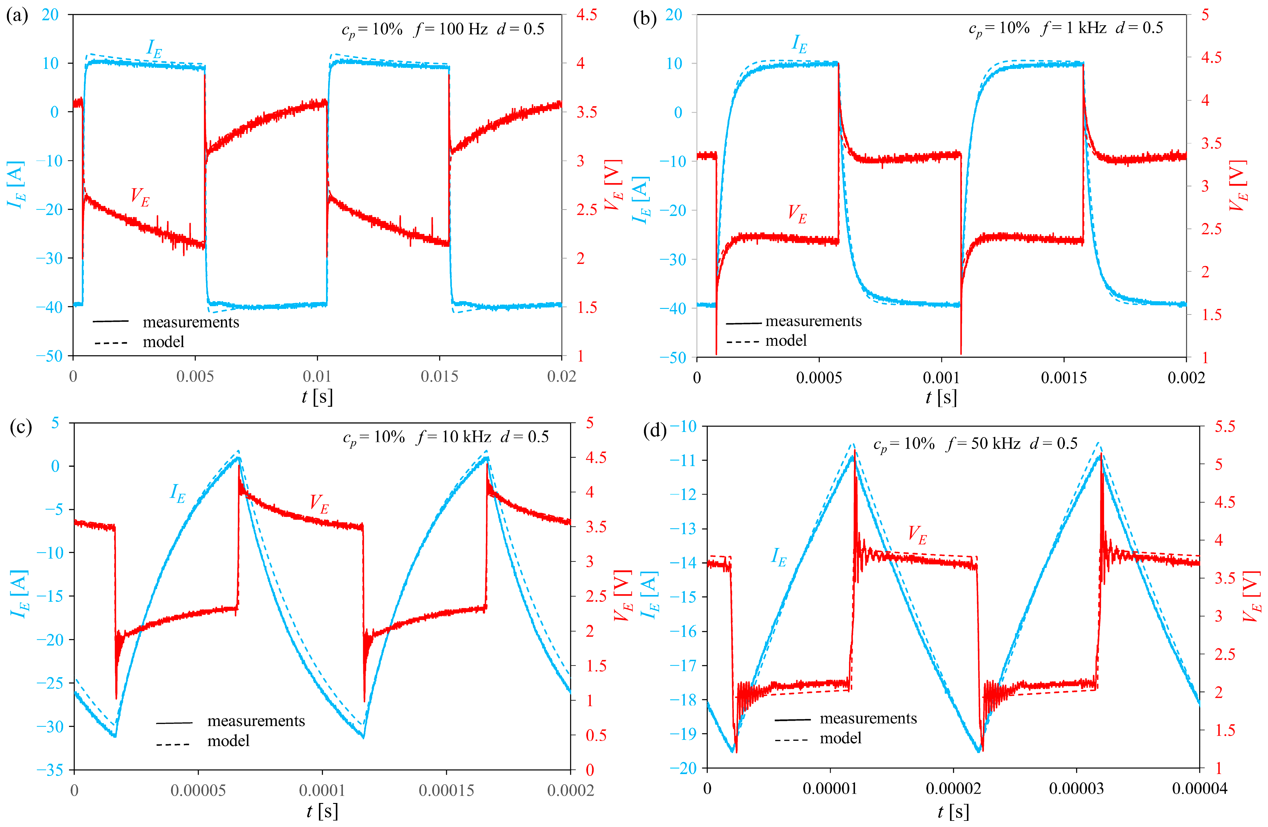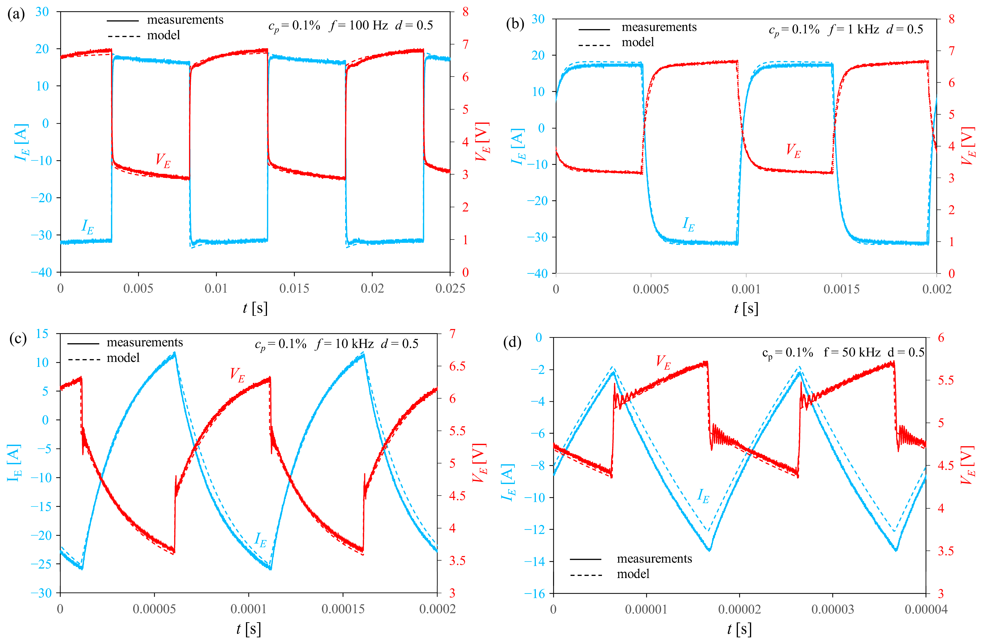 Figure 11, it can be concluded that the proposed electrolyzer model correctly describes its dynamic properties across a wide range of frequencies, duty cycles, and liquid concentrations. At the same time, it can be stated that the voltage and current waveforms are significantly influenced by the parasitic capacitances and inductances of this device. The value of MSE, normalized to the peak-to-peak value of the presented