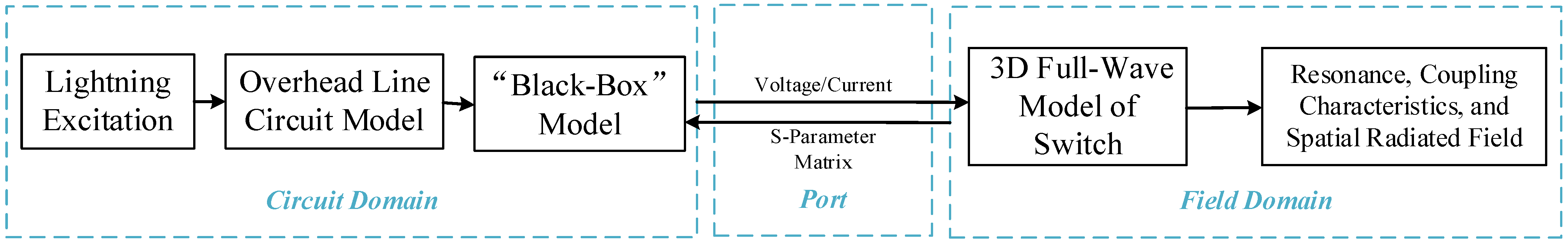 - A field-circuit hybrid simulation model of the primary–secondary integrated distribution switch under lightning impulse was established. A 3D electromagnetic full-wave model of the switch was constructed to simulate the complex electromagnetic processes and their influence on the spatial radiated field. In addition, a distributed parameter circuit model was built for the connecting lines to investigate the wave processes of lightning impulses along the transmission lines. These two models were coupled via a network parameter matrix to form the field-circuit hybrid model, enabling a comprehensive consideration of the impacts of transmission lines and switch structural components on electromagnetic disturbance characteristics.