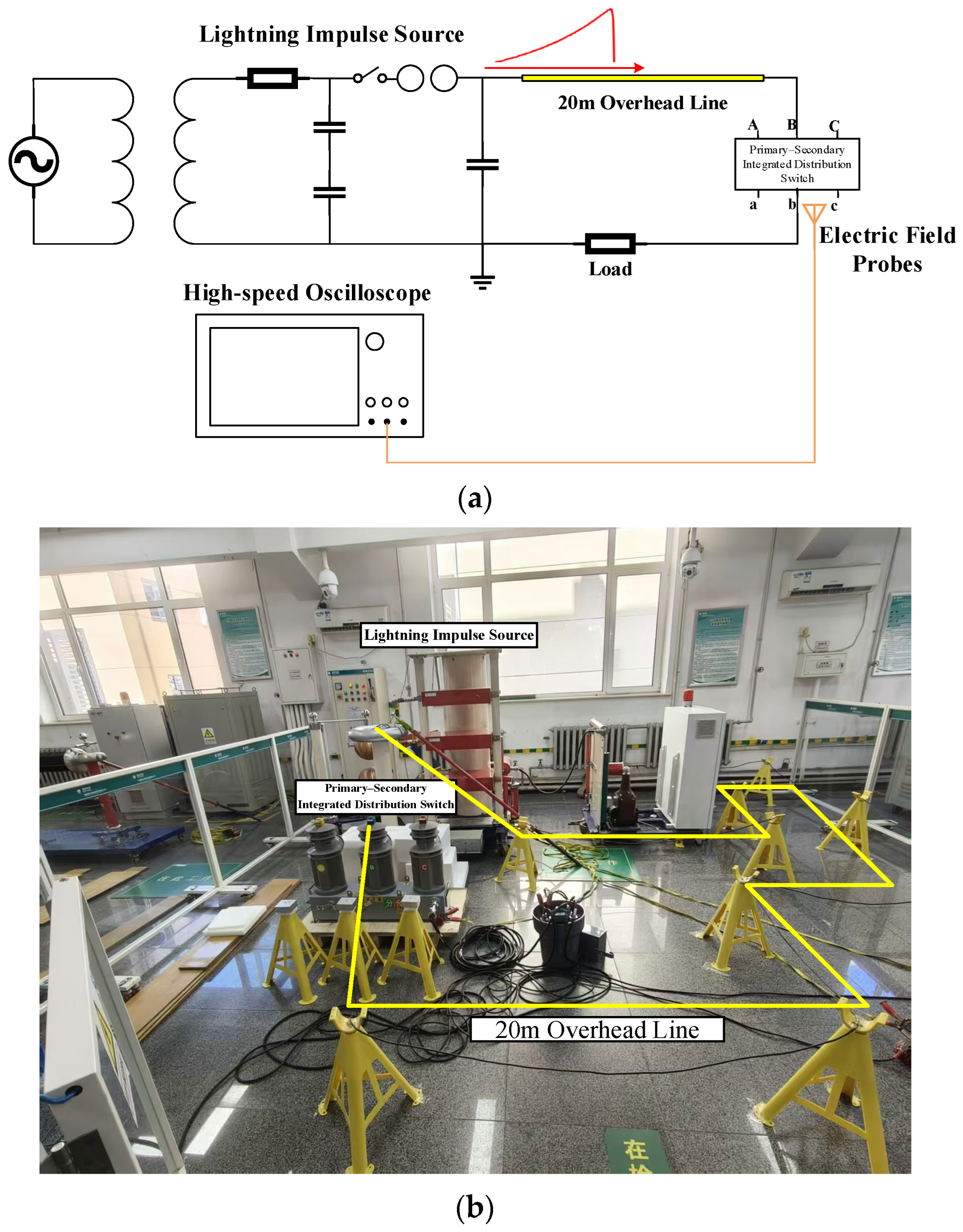 - Cheng, X.; Zhu, J.; Zhao, H.; Yuan, X.; He, X.; Xu, M. Study on electromagnetic interference of primary–secondary integrated switchgear under lightning impulse. J. Zhengzhou Univ. (Eng. Sci.) 2020, 41, 74–80. [Google Scholar]