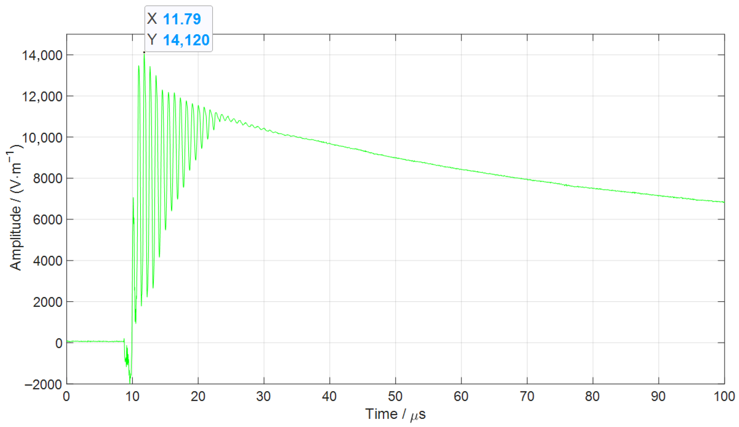 - A lightning impulse experimental platform for the distribution switch with a line length of 20 m was constructed. A 75 kV standard lightning impulse voltage waveform was injected into Phase B of the switch. The amplitude of the radiated electric field measured at a distance of 500 mm from the voltage transformer was 14.12 kV/m, with a deviation of less than 5% between the simulation and experimental results. The characteristic frequency was approximately 1.11 MHz, with a deviation of less than 20%. The comparison between the actual lightning impulse experimental results and the simulation results validates the effectiveness of the proposed modeling method.