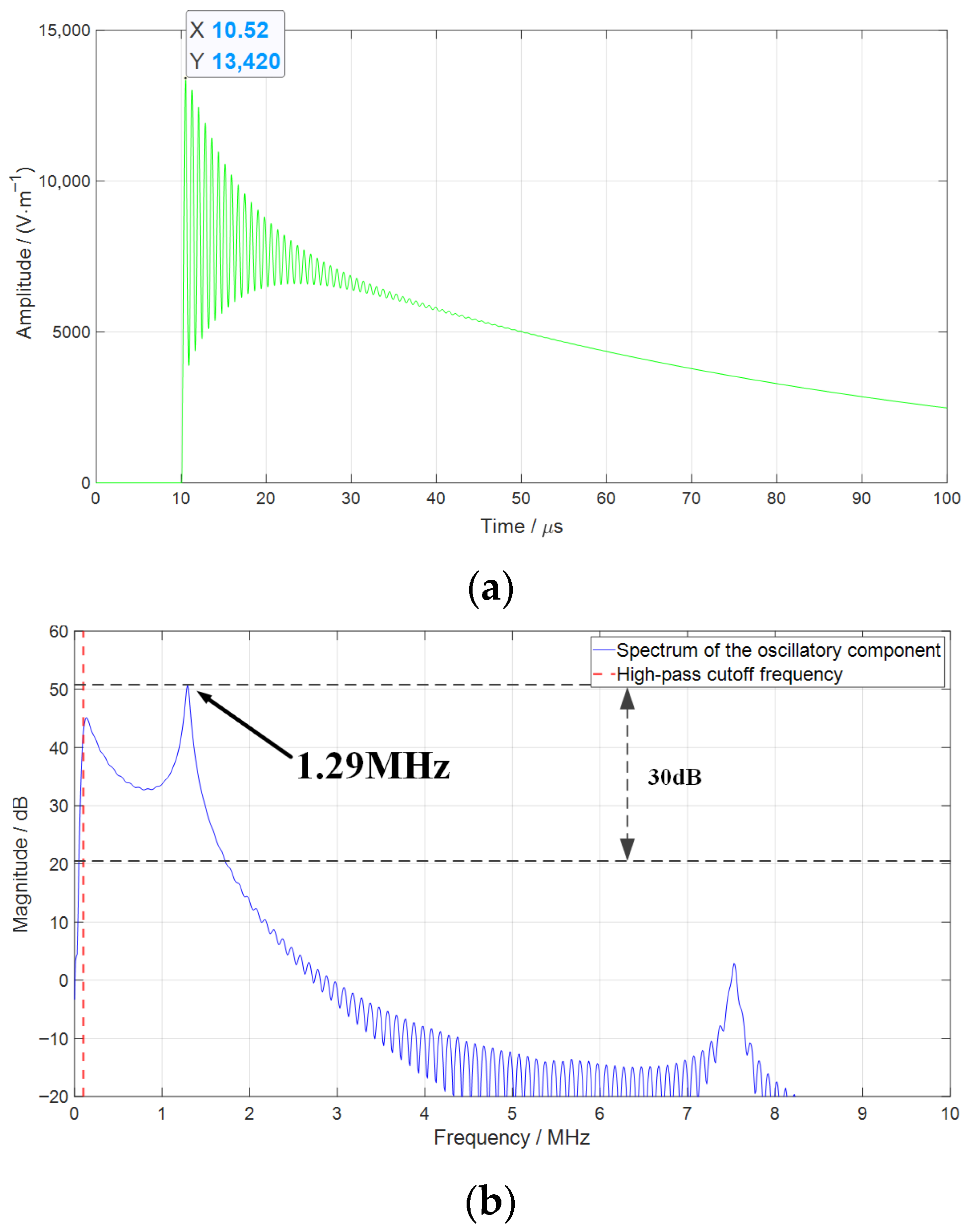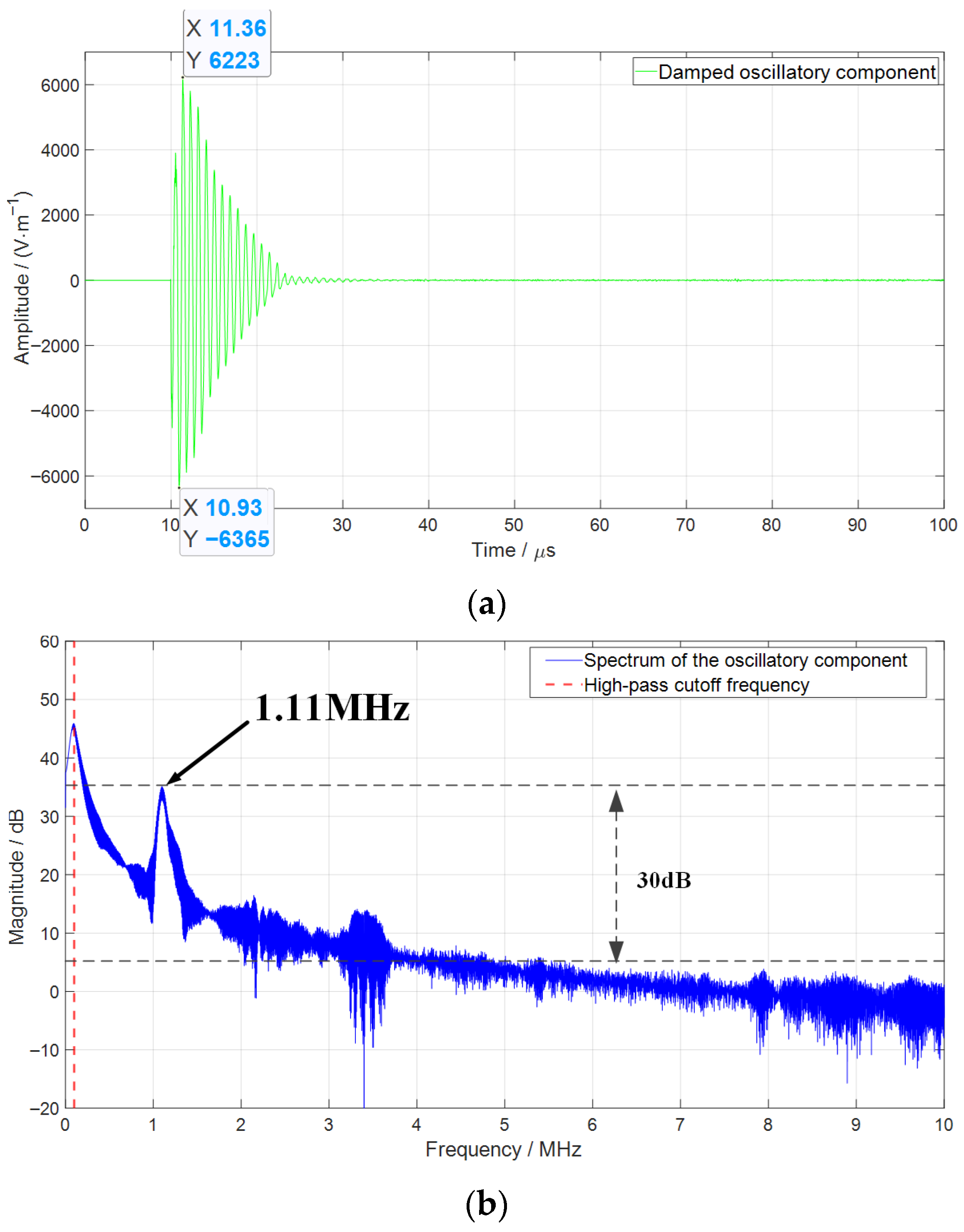 - The lightning disturbance signal consists of a lightning traveling wave component superimposed with a damped oscillatory component. The high-frequency oscillatory component is caused by the reflections of traveling wave along the overhead lines. Its characteristic frequency is determined by the length of the transmission lines connected to the switch and is approximately inversely proportional to the transmission line length. Additionally, the amplitude of the high-frequency oscillatory component is related to the load connected to the output terminal; specifically, with a constant transmission line length, a larger load corresponds to a higher amplitude of the high-frequency oscillatory component.