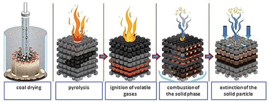 Pulverized coal combustion is a complex, step-by-step physicochemical process. The fact that coal is in a fine-grained form eliminates serious problems such as the inability to cope with load fluctuations due to its limited combustion efficiency, difficulties in removing large amounts of ash, and combustion disruptions caused by the resulting ash [23]. The first stage of the pulverized coal combustion process is the preparation of the coal fraction by grinding it in mills. The pulverized coal is then introduced into the combustion chamber by a hot stream of primary air using pneumatic pulverized coal ducts [24]. To ensure complete combustion, supplementary air (known as secondary air) is supplied separately to the combustion chamber. The combustion process itself can also be divided into specific stages, as schematically shown in Figure 3.